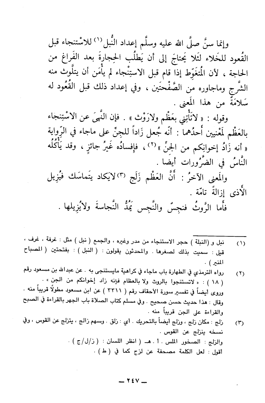 وقوله: (لا تأتني بعظم ولا روث) فإن النهي عن الاستنجاء بالعظم لمعنيين أحدهما: أنه جعل زادا للجن على ما جاء في الرواية (أنه زاد إخوانكم من الجن) فإفساده غير جائز، وقد يأكله الناس في الضرورات أيضا.