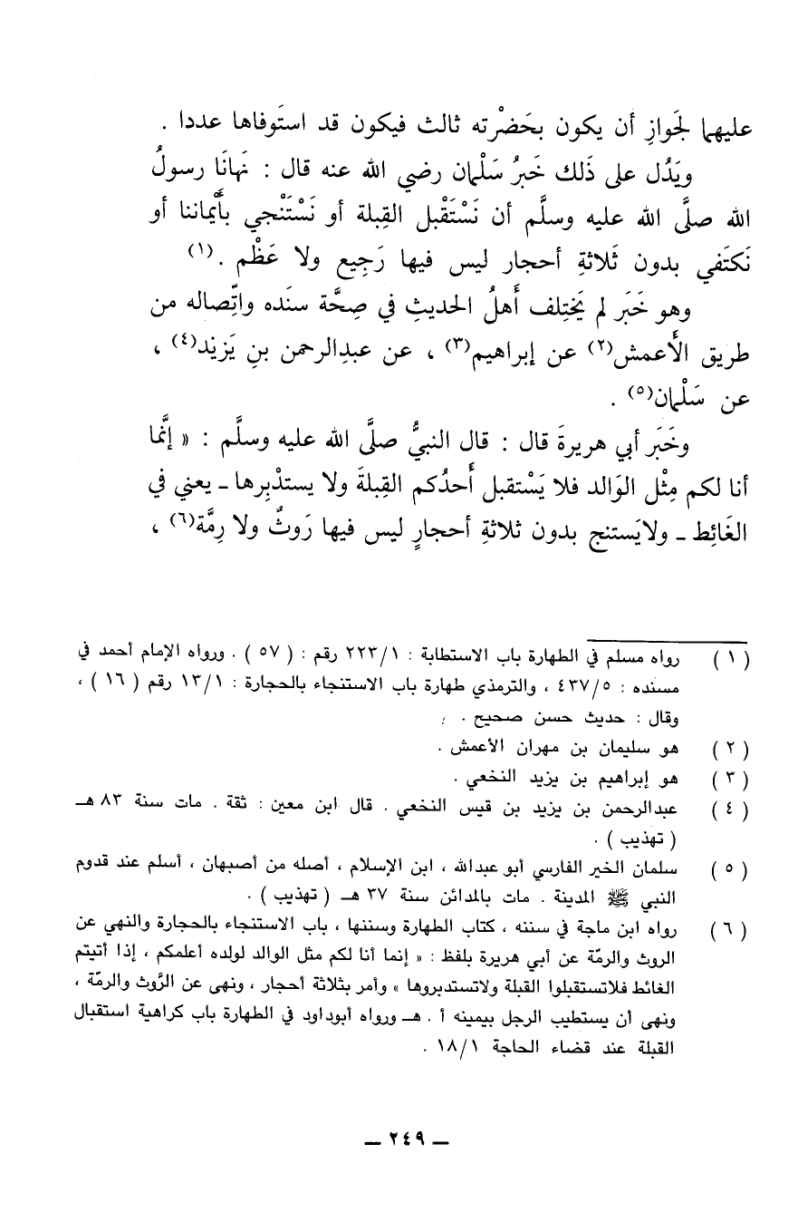 ويدل على ذلك خبر سلمان رضي الله عنه قال: نهانا رسول الله صلى الله عليه وسلم أن نستقبل القبلة أو نستنجي بأيماننا أو نكتفي بدون ثلاثة أحجار ليس فيها رجيع ولا عظم.