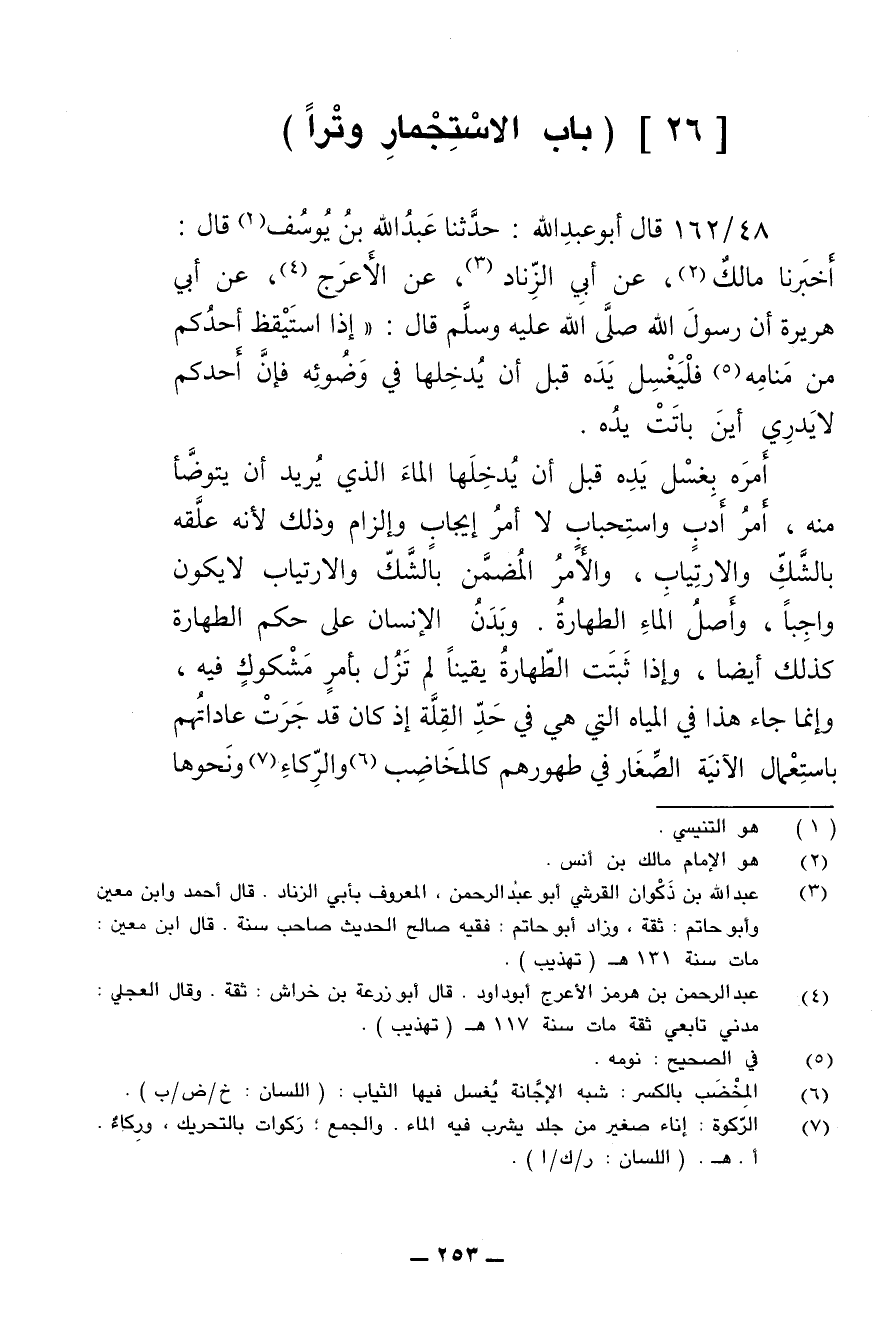 48/ 162 - قال أبو عبد الله: حدثنا عبد الله بن يوسف قال: أخبرنا مالك، عن أبي الزناد، عن الأعرج، عن أبي هريرة أن رسول الله صلى الله عليه وسلم قال: (إذا استيقظ أحدكم من منامه فليغسل يده قبل أن يدخلها في وضوئه فإن أحدكم لا يدري أين باتت يده).