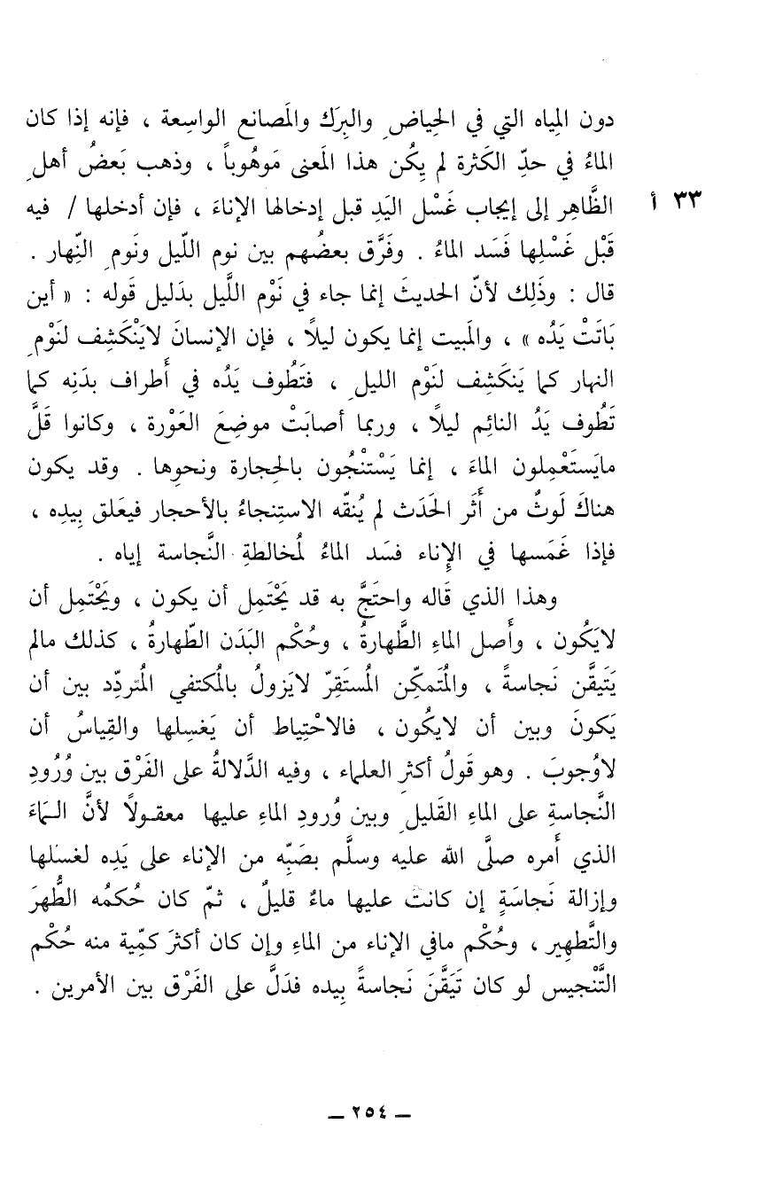 دون المياه التي في الحياض والبرك والمصانع الواسعة، فإنه إذا كان الماء في حد الكثرة لم يكن هذا المعنى موهوبا [موهوما]، وذهب بعض أهل الظاهر إلى إيجاب غسل اليد قبل إدخالها الإناء، فإن أدخلها فيه قبل غسلها فسد الماء. وفرق بعضهم بين نوم الليل ونوم النهار. قال: وذلك لأن الحديث إنما جاء في نوم الليل بدليل قوله: (أين باتت يده)، والمبيت إنما يكون ليلا، فإن الإنسان لا ينكشف لنوم النهار كما ينكشف لنوم الليل، فتطوف يده في أطراف بدنه كما تطوف يد النائم ليلا، وربما أصابت موضع العورة، وكانوا قل ما يستعملون الماء، إنما يستنجون بالحجارة ونحوها. وقد يكون هناك لوث من أثر الحدث لم ينقه الاستنجاء بالأحجار فيعلق بيده، فإذا غمسها في الإناء فسد الماء لمخالطة النجاسة إياه.