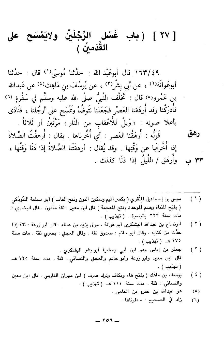 49/ 163 - قال أبو عبد الله: حدثنا موسى قال: حدثنا أبو عوانة، عن أبي بشر، عن يوسف بن ماهك عن عبد الله بن عمرو قال: تخلف النبي صلى الله عليه وسلم في سفرة فأدركنا وقد أرهقنا العصر فجعلنا نتوضأ ونمسح على أرجلنا، فنادى بأعلا [بأعلى] صوته: (ويل للأعقاب من النار) مرتين أو ثلاثا.