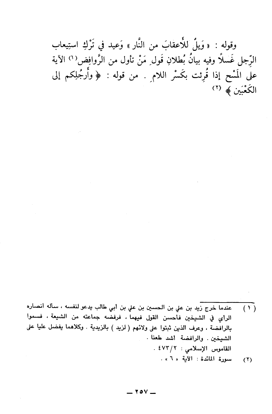 وقوله: (ويل للأعقاب من النار) وعيد في ترك استيعاب الرجل غسلا وفيه بيان بطلان قول من تأول من الروافض الآية على المسح إذا قرئت بكسر اللام. من قوله: {وأرجلكم إلى الكعبين}.