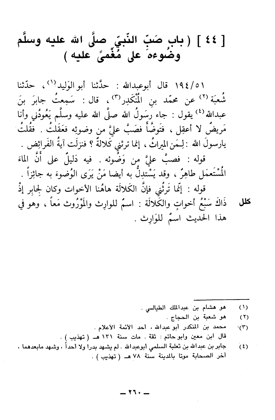 51/ 194 - قال أبو عبد الله: حدثنا أبو الوليد، حدثنا شعبة عن محمد بن المنكدر، قال: سمعت جابر بن عبد الله يقول: جاء رسول الله صلى الله عليه وسلم يعودني وأنا مريض لا أعقل، فتوضأ فصب علي من وضوئه فعقلت. فقلت يا رسول الله: لمن الميراث، إنما ترثني كلالة؟ فنزلت آية الفرائض.