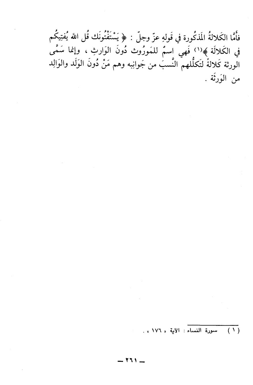 فأما الكلالة المذكورة في قوله عز وجل: {يستفتونك قل الله يفتيكم في الكلالة} فهي اسم للموروث دون الوارث، وإنما سَمَّى [سُمِّي] الورثة كلالة لتكللهم النسب من جوانبه وهم مَن دون الولد والوالد من الورثة.