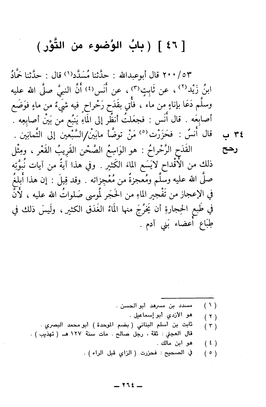 53/ 200 - قال أبو عبد الله: حدثنا مسدد قال: حدثنا حماد بن زيد، عن ثابت، عن أنس أن النبي صلى الله عليه وسلم دعا بإناء من ماء، فأتي بقدح رحراح فيه شيء من ماء فوضع أصابعه. قال أنس: فجعلت أنظر إلى الماء ينبع من بين أصابعه. قال أنس: فحزرت من توضأ ما بين السبعين إلى الثمانين.