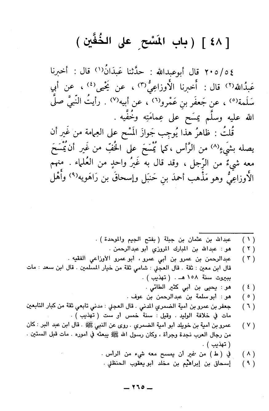 54/ 205 - قال أبو عبد الله: حدثنا عبدان قال: أخبرنا عبد الله قال: أخبرنا الأوزاعي، عن يحيى، عن أبي سلمة، عن جعفر بن عمرو، عن أبيه. رأيت النبي صلى الله عليه وسلم يمسح على عمامته وخفيه.