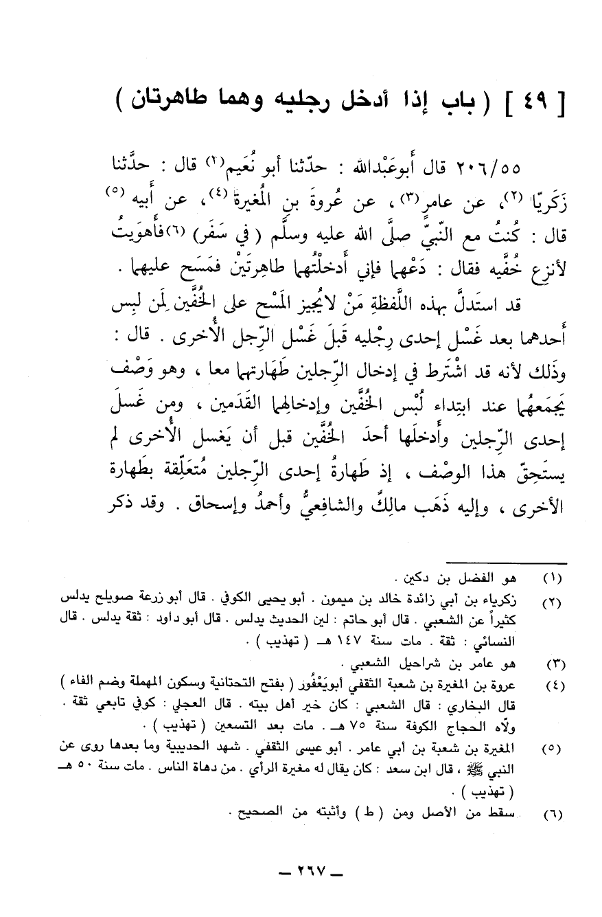 55/ 206 - قال أبو عبد الله: حدثنا أبو نعيم قال: حدثنا زكريا، عن عامر، عن عروة بن المغيرة، عن أبيه قال: كنت مع النبي صلى الله عليه وسلم (في سفر) فأهويت لأنزع خفيه فقال: دعهما فإني أدخلتهما طاهرتين فمسح عليهما.