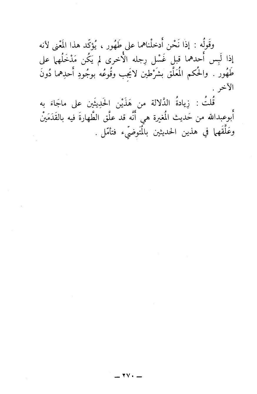 قلت: زيادة الدلالة من هذين الحديثين على ما جاء به أبو عبد الله من حديث المغيرة هي أنه قد علق الطهارة فيه بالقدمين وعلقهما في هذين الحديثين بالمتوضيء فتأمل.