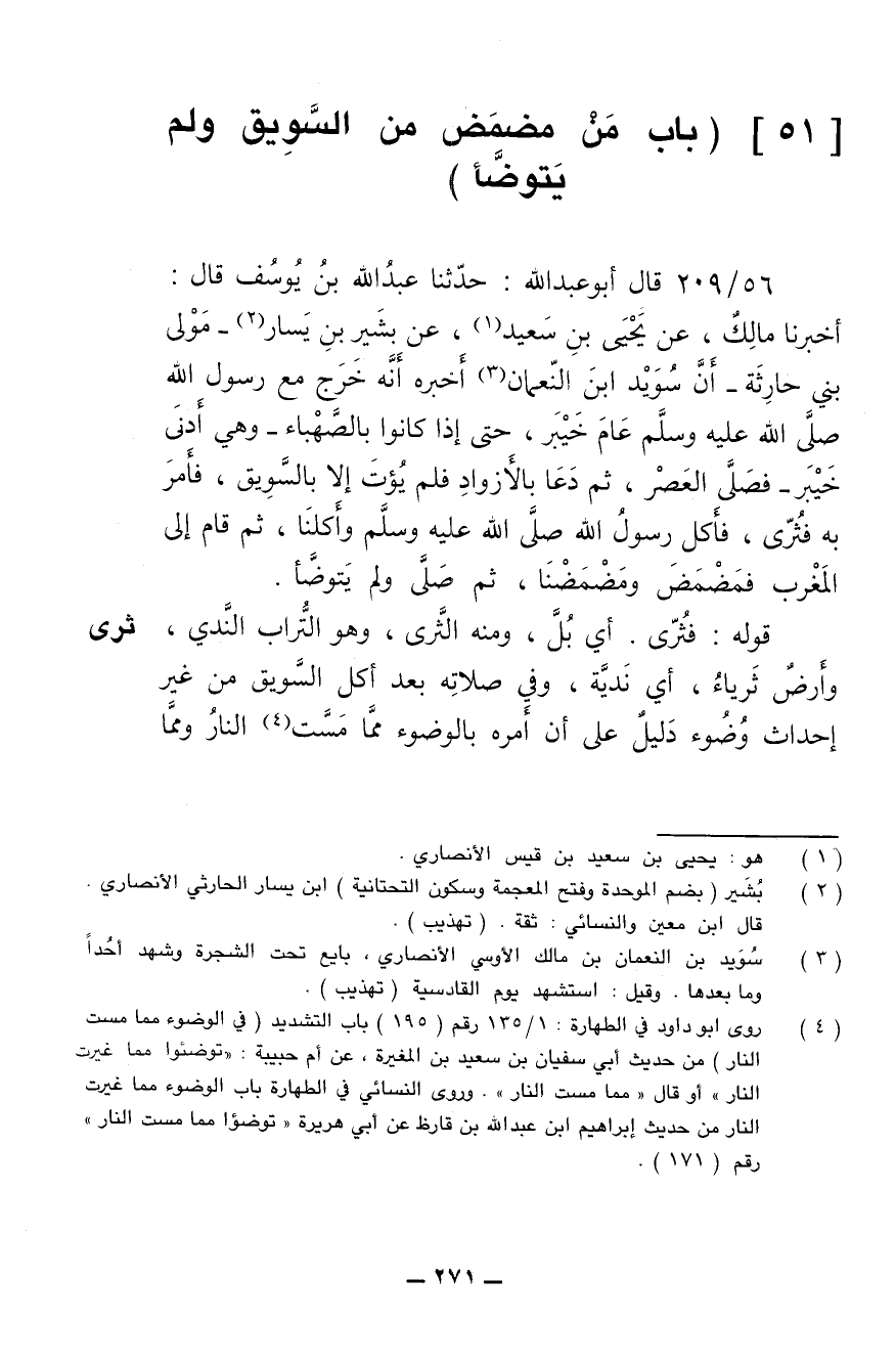 56/ 209 - قال أبو عبد الله: حدثنا عبد الله بن يوسف قال: أخبرنا مالك، عن يحيى بن سعيد، عن بشير بن يسار -مولى بني حارثة- أن سويد بن النعمان أخبره أنه خرج مع رسول الله صلى الله عليه وسلم عام خيبر، حتى إذا كانوا بالصهباء -وهي أدنى خيبر- فصلى العصر، ثم دعا بالأزواد فلم يؤت إلا بالسويق، فأمر به فثُرِّي، فأكل رسول الله صلى الله عليه وسلم وأكلنا، ثم قام إلى المغرب فمضمض ومضمضنا، ثم صلى ولم يتوضأ.