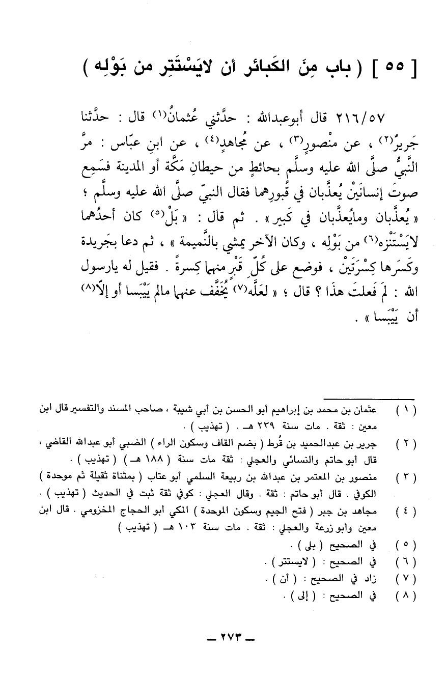 57/ 216 - قال أبو عبد الله: حدثني عثمان قال: حدثنا جرير، عن منصور، عن مجاهد، عن ابن عباس: مر النبي صلى الله عليه وسلم بحائط من حيطان مكة أو المدينة فسمع صوت إنسانين يعذبان في قبورهما فقال النبي صلى الله عليه وسلم: (يعذبان وما يعذبان في كبير). ثم قال: (بل كان أحدهما لا يستنزه من بوله، وكان الآخر يمشي بالنميمة)، ثم دعا بجريدة وكسرها كسرتين، فوضع على كل قبر منهما كسرة. فقيل له يا رسول الله: لم فعلت هذا؟ قال: (لعله يخفف عنهما ما لم ييبسا أو إلا أن ييبسا).