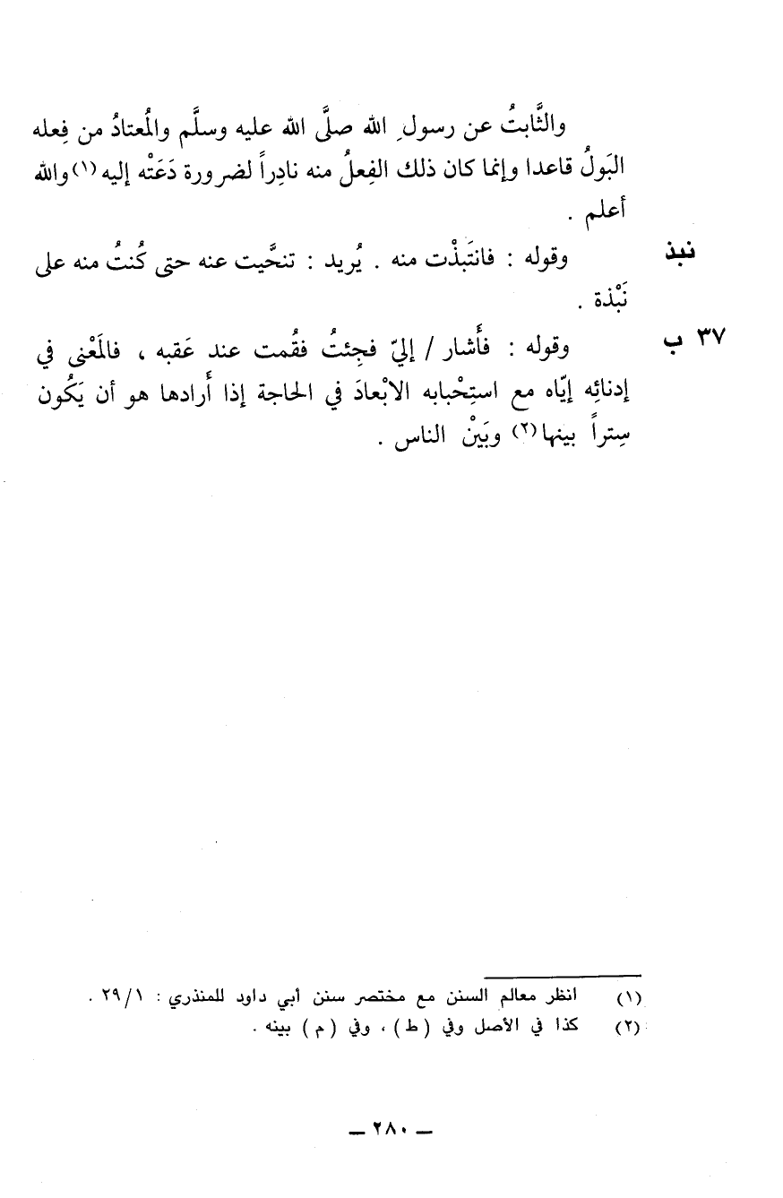 وقوله: فأشار إلي فجئت فقمت عند عقبه، فالمعنى في إدنائه إياه مع استحبابه الإبعاد في الحاجة إذا أرادها هو أن يكون سترا بينها وبين الناس.
