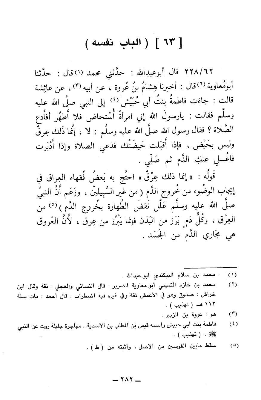 62/ 228 - قال أبو عبد الله: حدثني محمد قال: حدثنا أبو معاوية قال: أخبرنا هشام بن عروة، عن أبيه، عن عائشة قالت: جاءت فاطمة بنت أبي حبيش إلى النبي صلى الله عليه وسلم فقالت: يا رسول الله إني امرأة أستحاض فلا أطهر أفأدع الصلاة؟ فقال رسول الله صلى الله عليه وسلم: لا، إنما ذلك عرق وليس بحيض، فإذا أقبلت حيضتك فدعي الصلاة وإذا أدبرت فاغسلي عنك الدم ثم صلي.