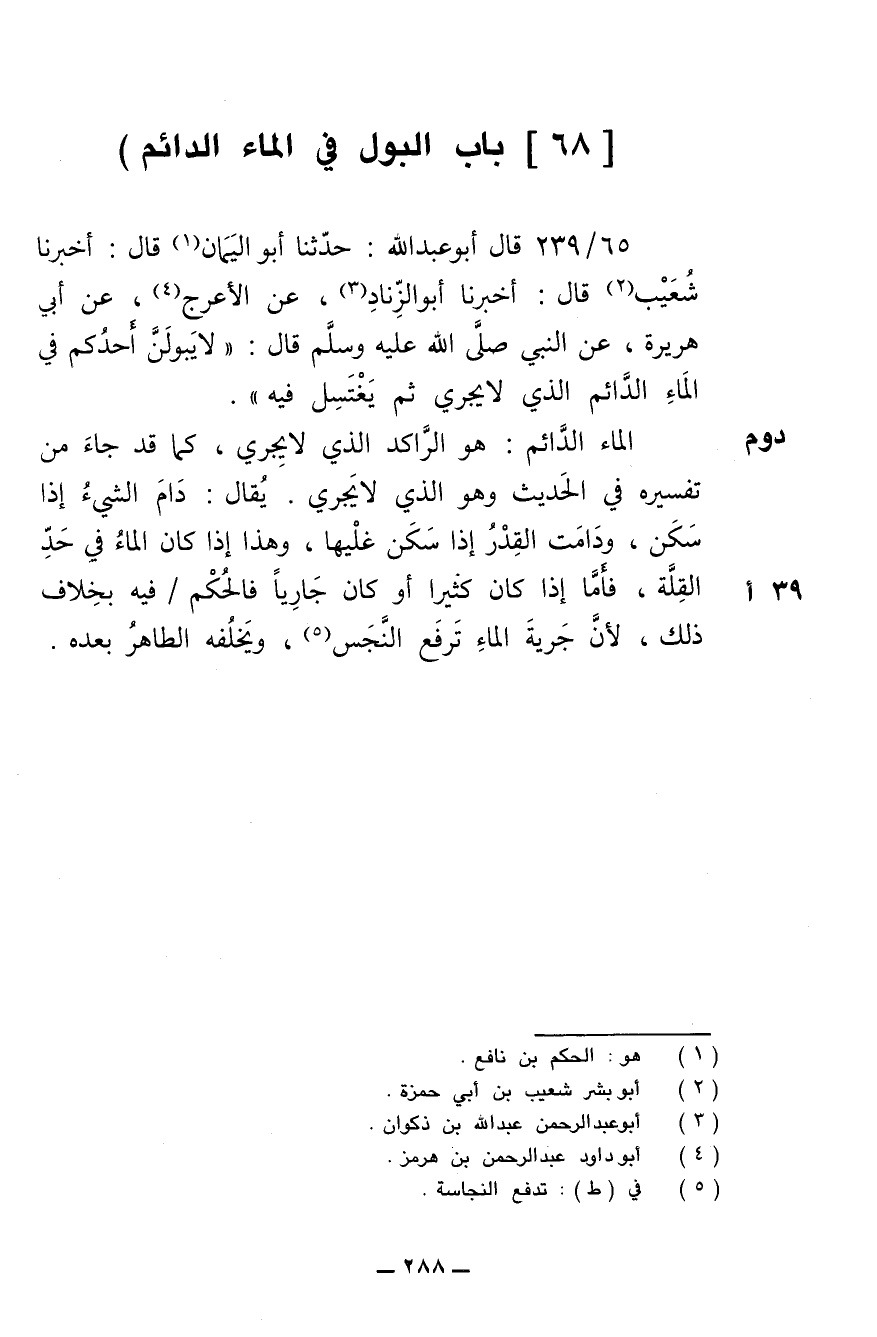 65/ 239 - قال أبو عبد الله: حدثنا أبو اليمان قال: أخبرنا شعيب قال: أخبرنا أبو الزناد عن الأعرج، عن أبي هريرة عن النبي صلى الله عليه وسلم قال: (لا يبولن أحدكم في الماء الدائم الذي لا يجري ثم يغتسل فيه).