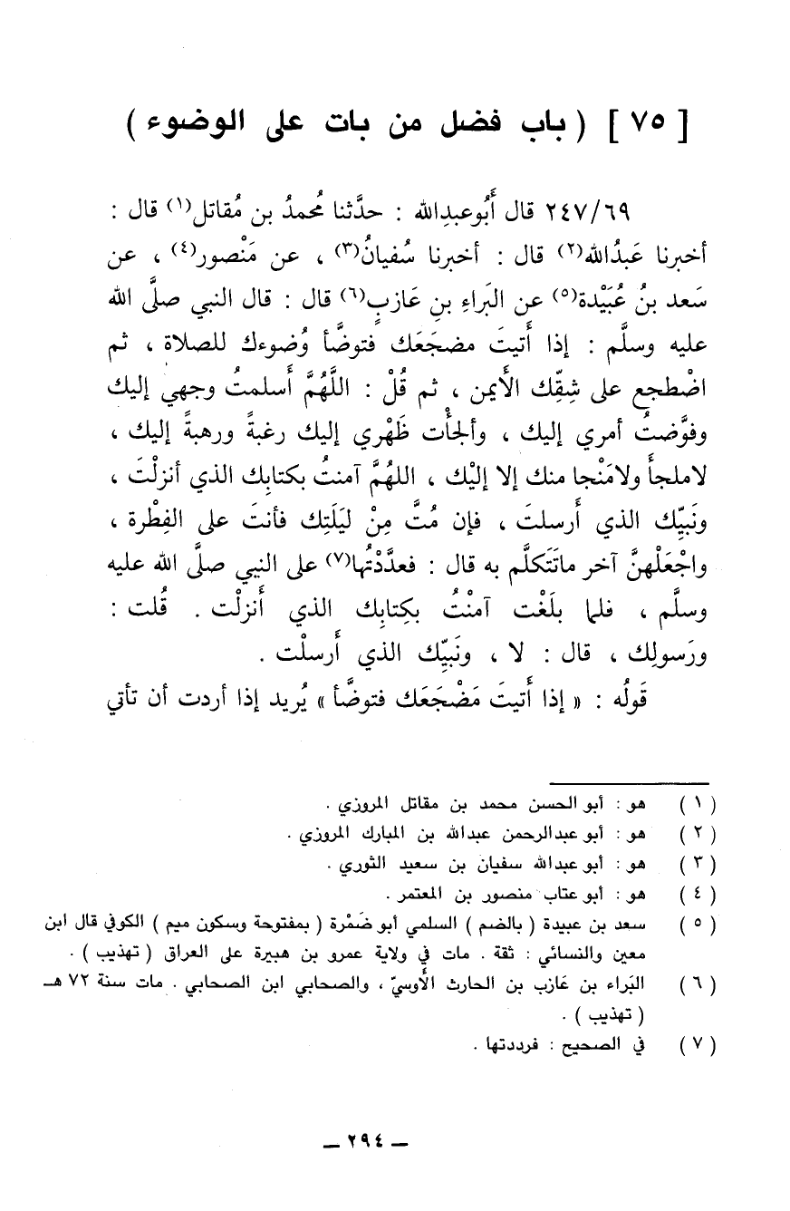 69/ 247 - قال أبو عبد الله: حدثنا محمد بن مقاتل قال: أخبرنا عبد الله قال: أخبرنا سفيان، عن منصور، عن سعد بن عبيدة عن البراء بن عازب قال: قال النبي صلى الله عليه وسلم: إذا أتيت مضجعك فتوضأ وضوءك للصلاة، ثم اضطجع على شقك الأيمن، ثم قل: اللهم أسلمت وجهي إليك وفوضت أمري إليك، وألجأت ظهري إليك رغبة ورهبة إليك، لا ملجأ ولا منجا منك إلا إليك، اللهم آمنت بكتابك الذي أنزلت، ونبيك الذي أرسلت، فإن مت من ليلتك فأنت على الفطرة، واجعلهن آخر ما تتكلم به قال: فعددتها على النبي صلى الله عليه وسلم، فلما بلغت بكتابك الذي أنزلت قلت: ورسولك، قال: لا، ونبيك الذي أرسلت.