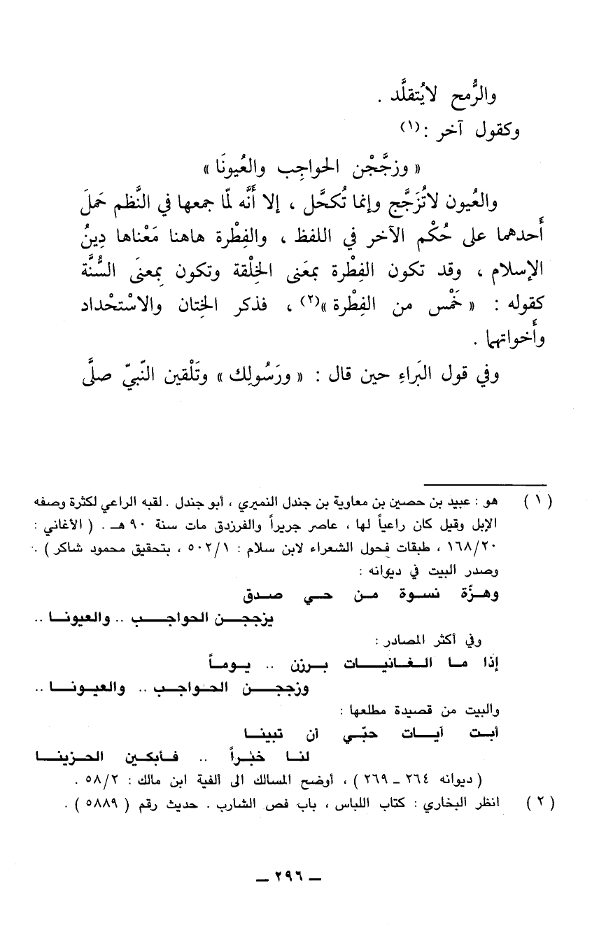 والعيون لا تزجج وإنما تكحل، إلا أنه لما جمعها في النظم حمل أحدهما على حكم الآخر في اللفظ، والفطرة هاهنا معناها دين الإسلام، وقد تكون الفطرة بمعنى الخلقة وتكون بمعنى السنة كقوله: (خمس من الفطرة)، فذكر الختان والاستحداد وأخواتهما.