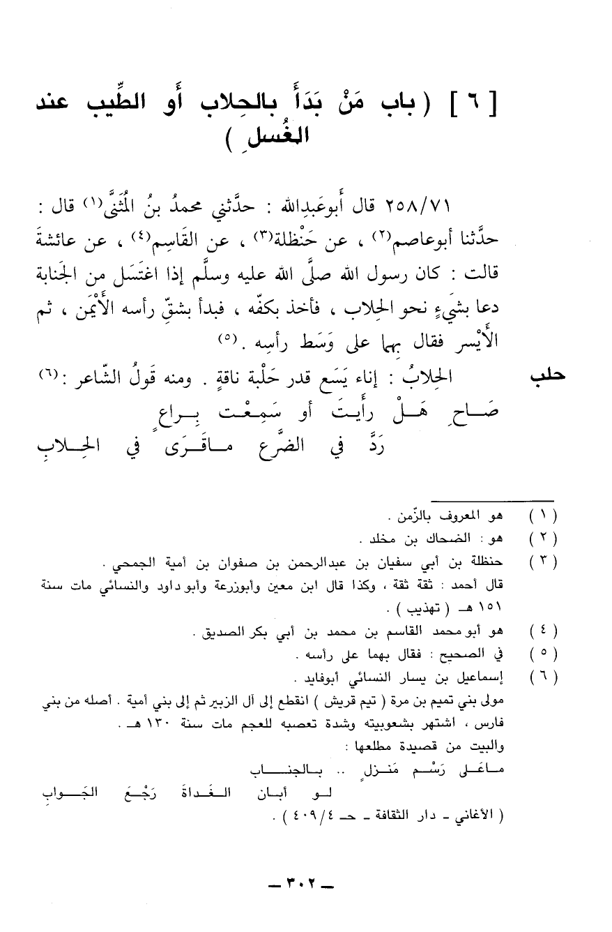 71/ 258 - قال أبو عبد الله: حدثني محمد بن المثنى قال: حدثنا أبو عاصم، عن حنظلة، عن القاسم، عن عائشة قالت: كان رسول الله صلى الله عليه وسلم إذا اغتسل من الجنابة دعا بشيء نحو الحلاب، فأخذ بكفه، فبدأ بشق رأسه الأيمن، ثم الأيسر فقال بهما على وسط رأسه.