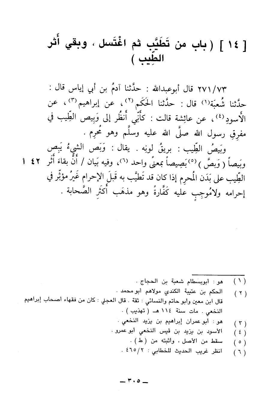 73/ 271 - قال أبو عبد الله: حدثنا آدم بن أبي إياس قال: حدثنا شعبة قال: حدثنا الحكم، عن إبراهيم، عن الأسود، عن عائشة قال: كأني أنظر إلى وبيص الطيب في مفرق رسول الله صلى الله عليه وسلم وهو محرم.