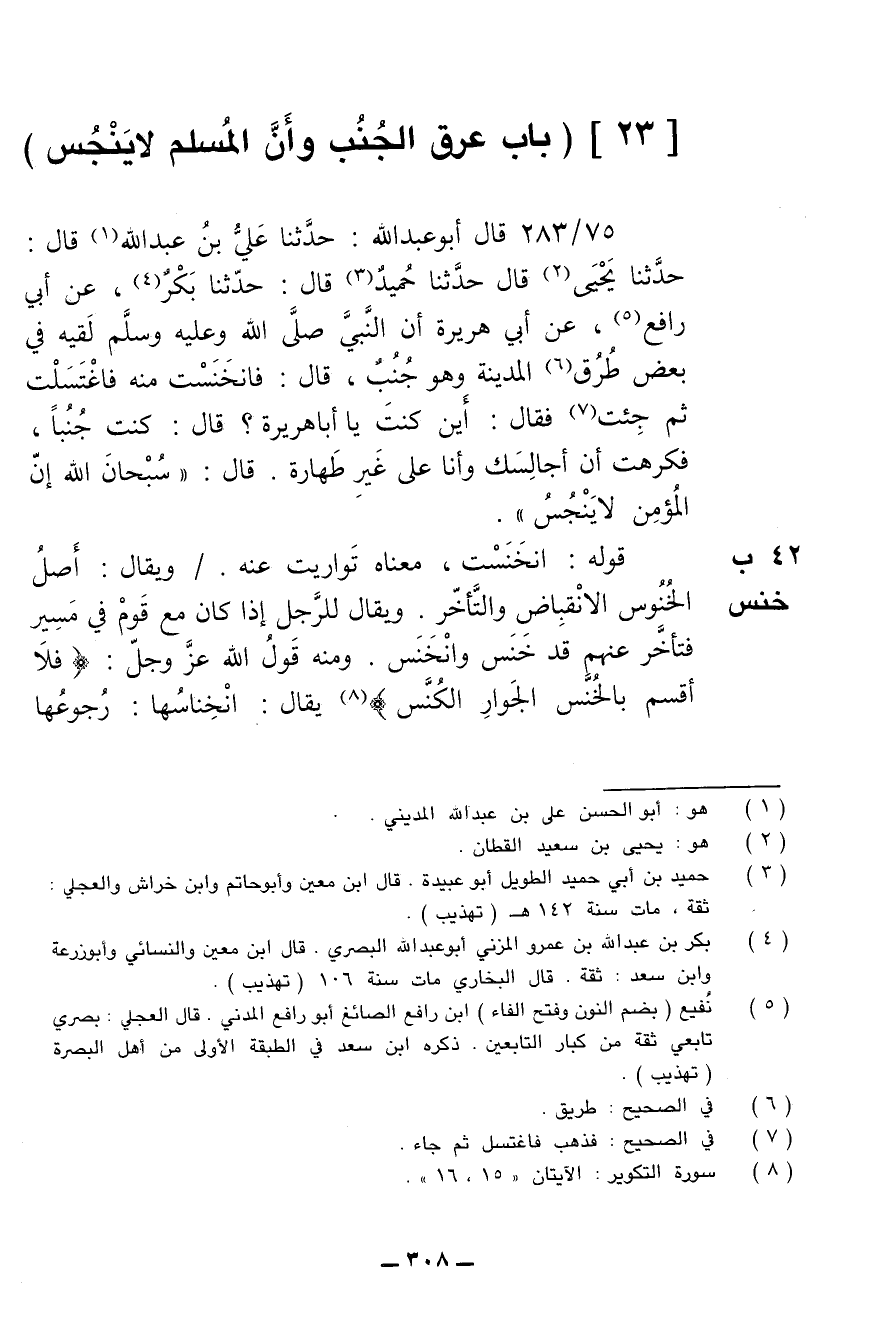 75/ 283 - قال أبو عبد الله: حدثنا علي بن عبد الله قال: حدثنا يحيى قال: حدثنا حميد قال: حدثنا بكر، عن أبي رافع، عن أبي هريرة أن النبي صلى الله عليه وسلم لقيه في بعض طرق المدينة وهو جنب، قال: فانخسنت منه فاغتسلت ثم جئت فقال: أين كنت يا أبا هريرة؟ قال: كنت جنبا، فكرهت أن أجالسك أنا على غير طهارة. قال: (سبحان الله إن المؤمن لا ينجس).
