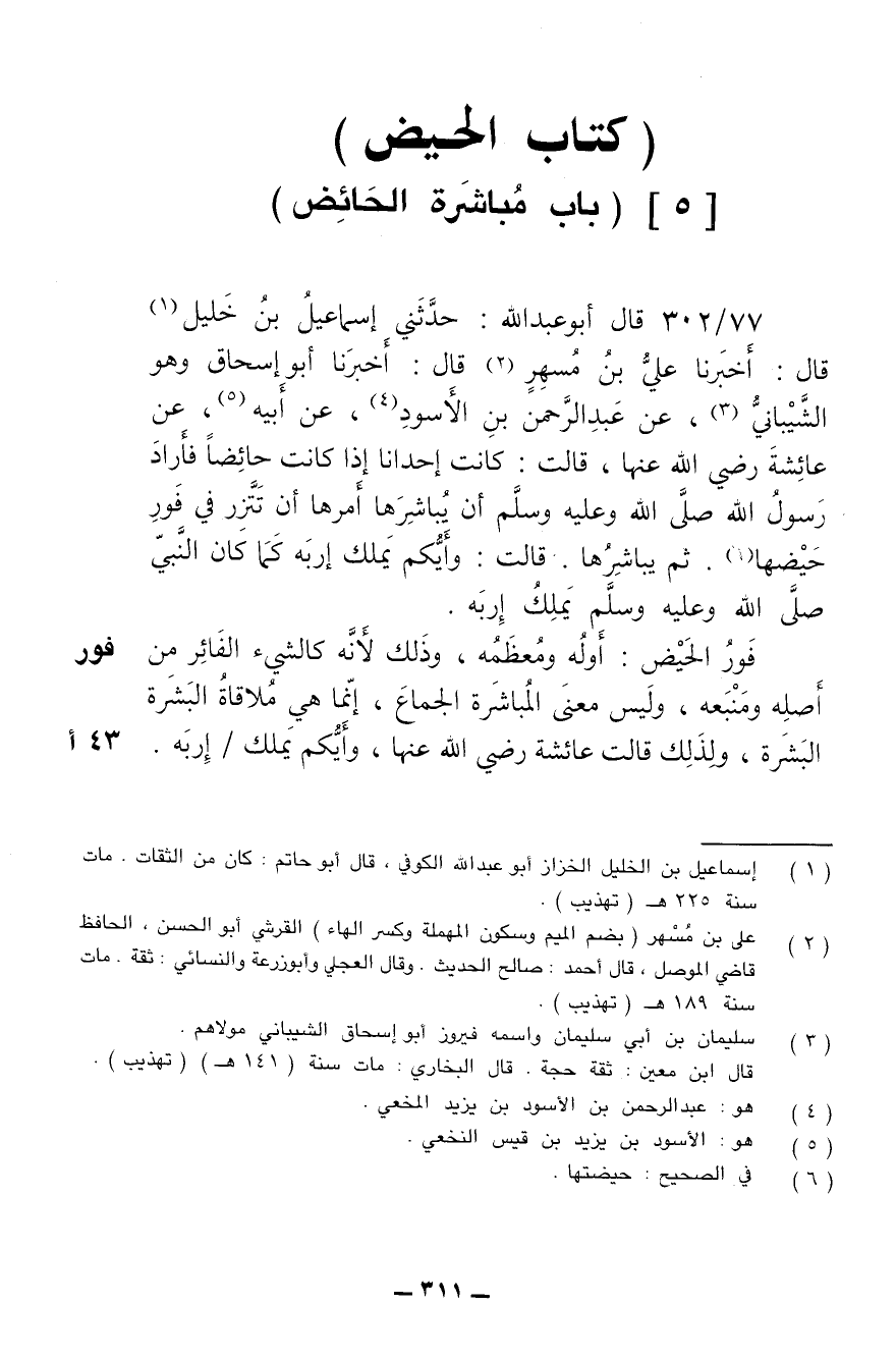 77/ 302 - قال أبو عبد الله: حدثني إسماعيل بن خليل قال: أخبرنا علي بن مسهر قال: أخبرنا أبو إسحاق وهو الشيباني، عن عبد الرحمن بن الأسود، عن أبيه، عن عائشة رضي الله عنها، قالت: كانت إحدانا إذا كانت حائضا فأراد رسول الله صلى الله عليه وسلم أن يباشرها أمرها أن تتزر في فور حيضها، ثم يباشرها. قالت: وأيكم يملك إربه كما كان النبي صلى الله عليه وسلم يملك إربه.