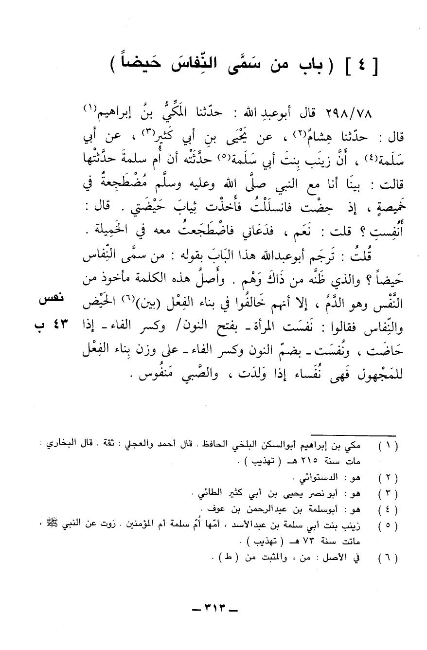 78/ 298 - قال أبو عبد الله: حدثنا المكي بن إبراهيم قال: حدثنا هشام، عن يحيى بن أبي كثير، عن أبي سلمة، أن زينب بنت أبي سلمة حدثته أن أم سلمة حدثتها قالت: بينا أنا مع النبي صلى الله عليه وسلم مضطجعة في خميصة، إذ حضت فانسللت فأخذت ثياب حيضتي. قال: أنفست؟ قلت: نعم، فدعاني فاضطجعت معه في الخميلة.