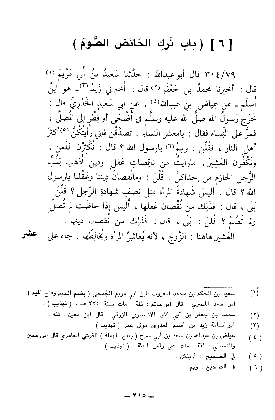 79/ 304 - قال أبو عبد الله: حدثنا سعيد بن أبي مريم قال: أخبرنا محمد بن جعفر قال: أخبرني زيد -هو ابن أسلم- عن عياض بن عبد الله، عن أبي سعيد الخدري قال: خرج رسول الله صلى الله عليه وسلم في أضحى أو فطر إلى المصلى، فمر على النساء، فقال: يا معشر النساء: تصدقن فإني رأيتكن أكثر أهل النار، فقلن: ومم يا رسول الله؟ قال: تكثرن اللعن، وتكفرن العشير، ما رأيت من ناقصات عقل ودين أذهب للب الرجل الحازم من إحداكن. قلن: وما نقصان ديننا وعقلنا يا رسول الله؟ قال: أليس شهادة المرأة مثل نصف شهادة الرجل؟ قلن: بلى، قال: فذلك من نقصان عقلها، أليس إذا حاضت لم تصل ولم تصم؟ قلن: بلى، قال: فذلك من نقصان دينها.