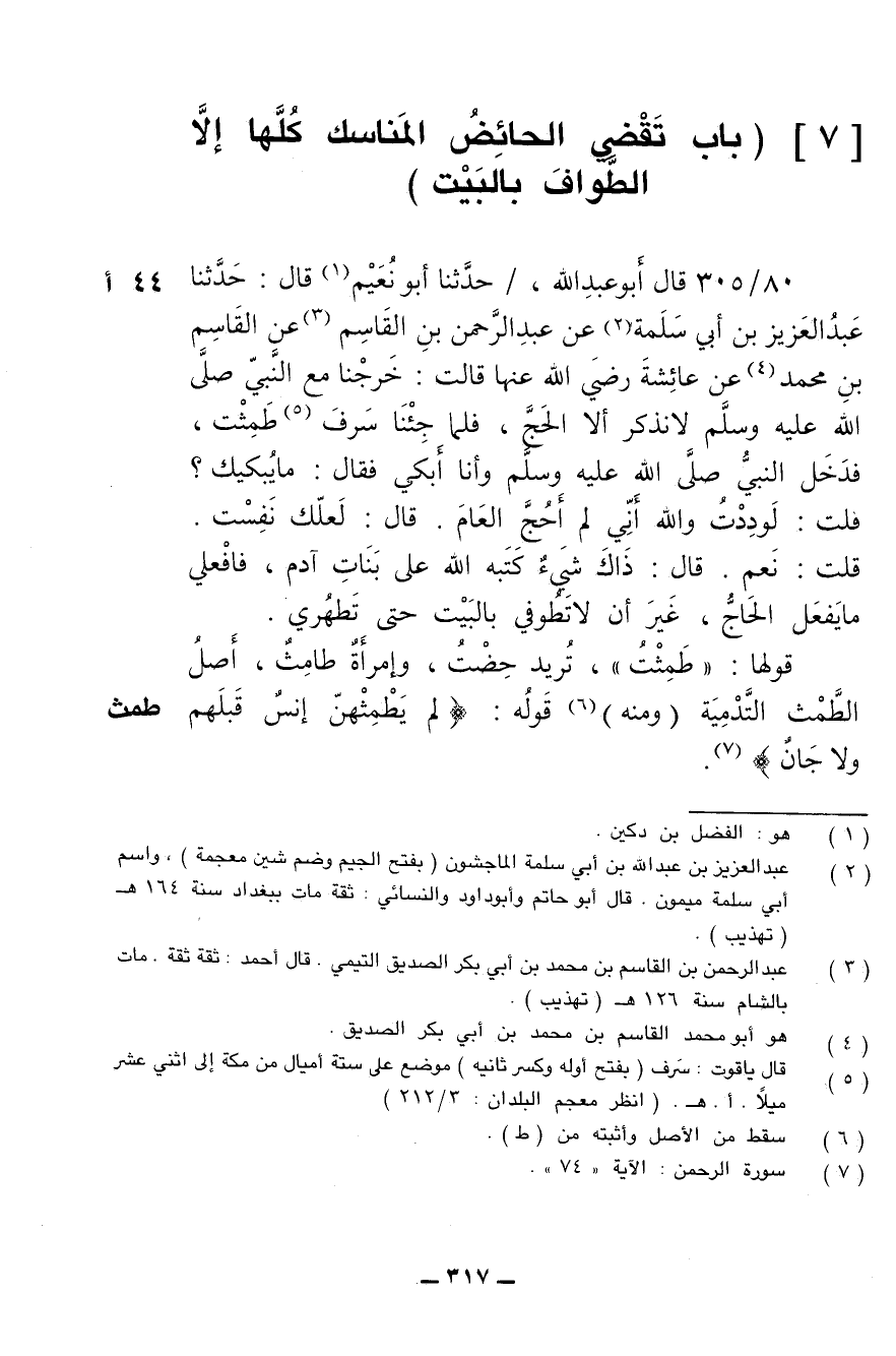 80/ 305 - قال أبو عبد الله: حدثنا أبو نعيم قال: حدثنا عبد العزيز بن أبي سلمة عن عبد الرحمن بن القاسم عن القاسم بن محمد عن عائشة رضي الله عنها قالت: خرجنا مع النبي صلى الله عليه وسلم لا نذكر إلا الحج، فلما جئنا سَرِفَ طمثت، فدخل النبي صلى الله عليه وسلم وأنا أبكي فقال: ما يبكي؟ قلت: لوددت والله أني لم أحج العام. قال: لعلك نفست. قلت: نعم. قال: ذاك شيء كتبه الله على بنات آدم، فافعلي ما يفعل الحاج، غير أن لا تطوفي بالبيت حتى تطهري.