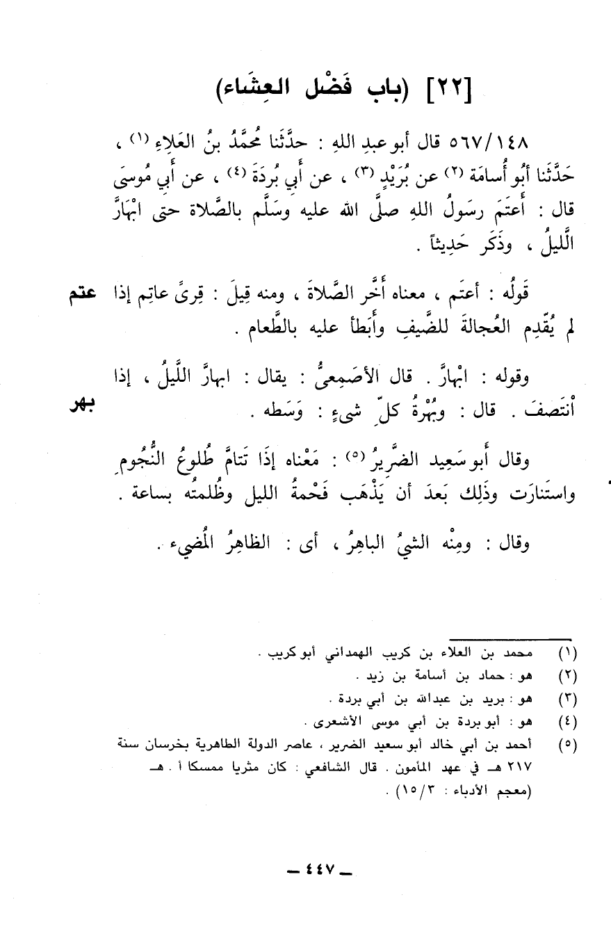 148/ 567 - قال أبو عبد الله: حدثنا محمد بن العلاء، حدثنا أبو أسامة عن بريد، عن أبي بردة، عن أبي موسى قال: أعتم رسول الله صلى الله عليه وسلم بالصلاة حتى ابهارَّ الليل، وذكر حديثا.