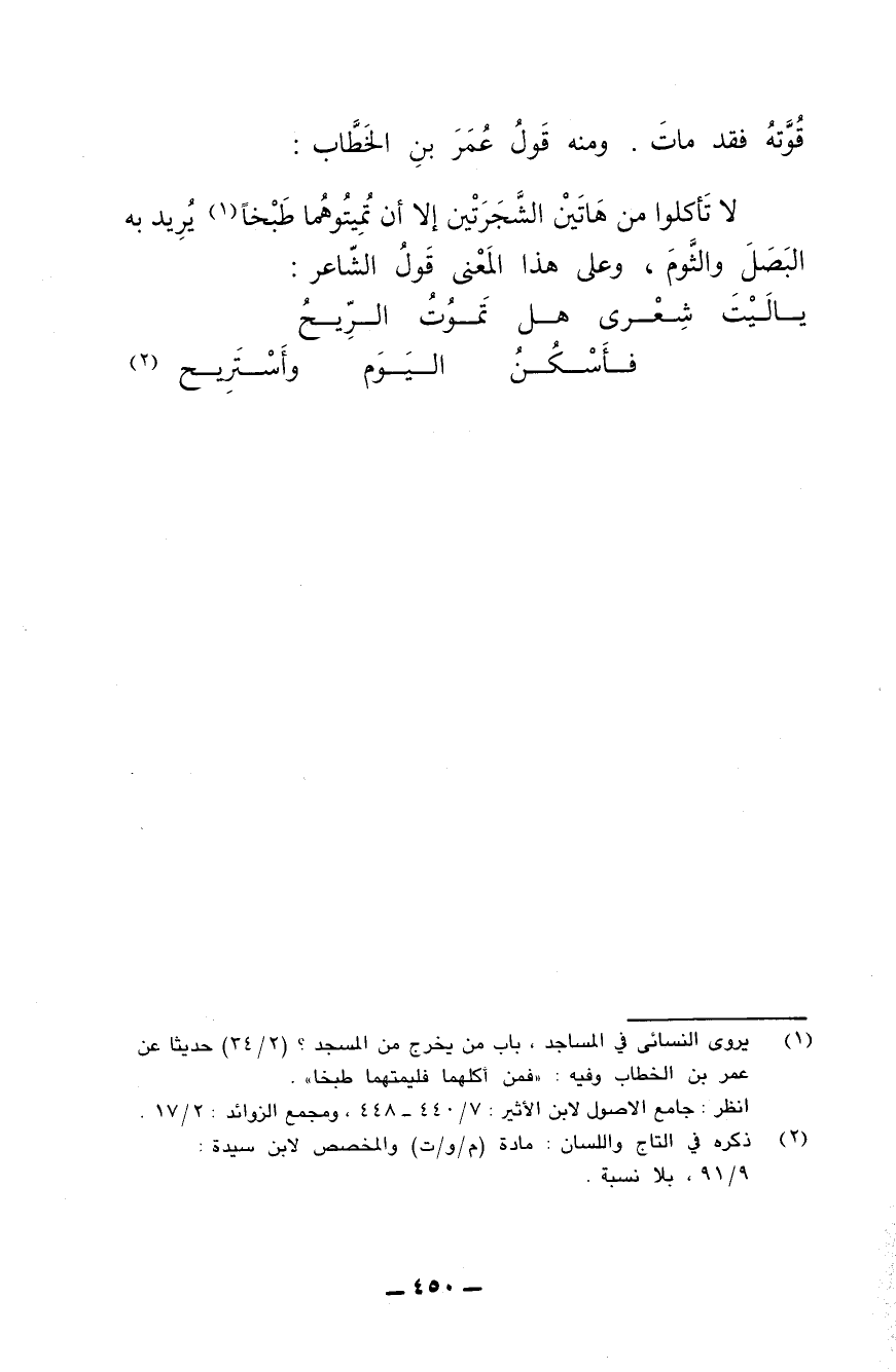 لا تأكلوا من هاتين الشجرتين إلا أن تميتموهما طبخا يريد به البصل والثُّوم، وعلى هذا المعنى قول الشاعر: