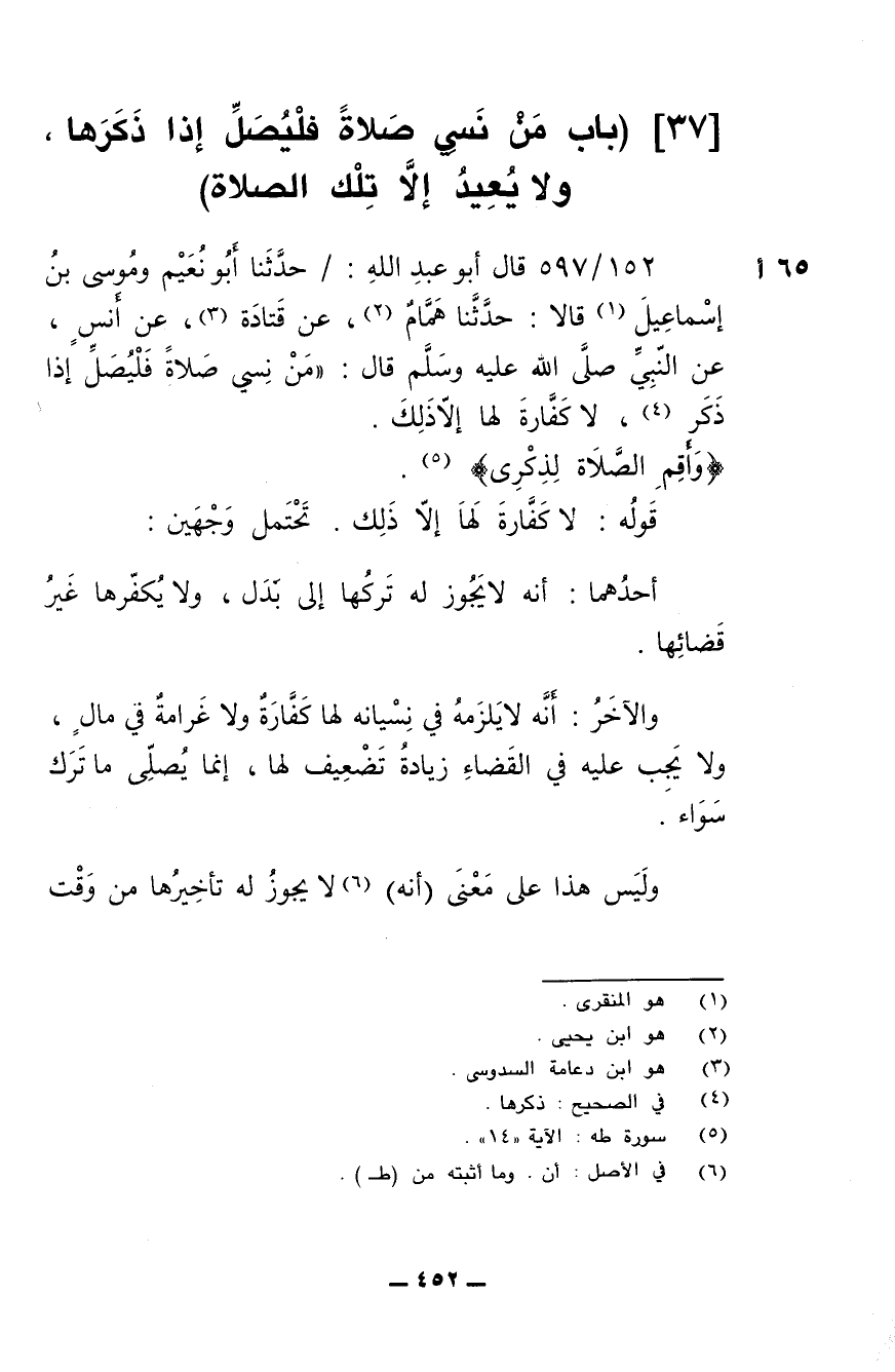 152/ 597 - قال أبو عبد الله: حدثنا أبو نعيم وموسى بن إسماعيل قالا: حدثنا همام عن قتادة عن أنس عن النبي صلى الله عليه وسلم قال: (من نسي صلاة فليصل إذا ذكر، لا كفارة لها إلا ذلك).