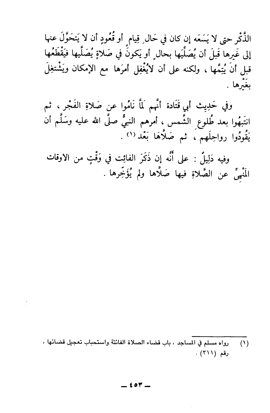 الذكر حتى لا يسعه إن كان في حال قيام أو قعود أن لا يتحول عنها إلى غيرها قبل أن يصليها بحال أو يكون في صلاة يصليها فيقطعها قبل أن يتمها، ولكنه على أن لا يغفل أمرها مع الإمكان ويشتغل بغيرها.