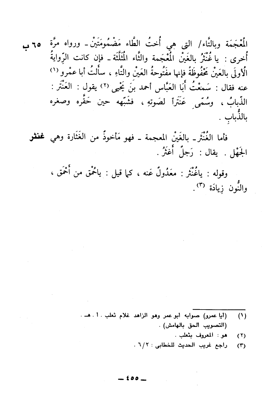 المعجمة وبالتاء التي هي أخت الطاء مضمومتين -ورواه مرة أخرى: يا غُنثَر بالغين المعجمة والثاء المثلثة- فإن كانت الرواية الأولى بالعين محفوظة فإنها مفتوحة العين والتاء، سألت أبا عمرو [الصواب: أبو عُمَر الزاهد] عنه فقال: سمعت أبا العباس أحمد بن يحيى يقول: العنتر: الذباب، وسمي عنترا [؟] لصوته، فشبهه حين حقره وصغره بالذباب.