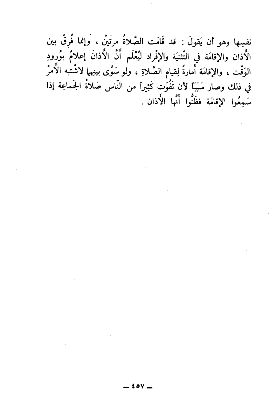 نفسها وهو أن يقول: قد قامت الصلاة مرتين، وإنما فرق بين الأذان والإقامة في التثنية والإفراد ليعلم أن الأذان إعلام بورود الوقت والإقامة أمارة لقيام الصلاةن ولو سوى بينهما لاشتبه الأمر في ذلك وصار سببا لأن تفوت كثيرا من الناس صلاة الجماعة إذا سمعوا الإقامة فظنوا أنها الأذان.