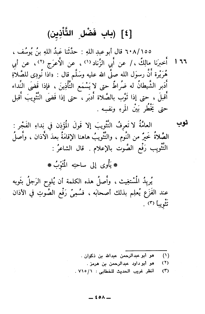 155/ 608 - قال أبو عبد الله: حدثنا عبد الله بن يوسف، أخبرنا مالك، عن أبي الزناد، عن الأعرج، عن أبي هريرة أن رسول الله صلى الله عليه وسلم قال: (إذا نودي للصلاة أدبر الشيطان له ضراط حتى لا يسمع التأذين، فإذا قضي النداء أقبل، حتى إذا ثوب بالصلاة أدبر، حتى إذا قضي التثويب أقبل، حتى يخطُر بين المرء ونفسه.