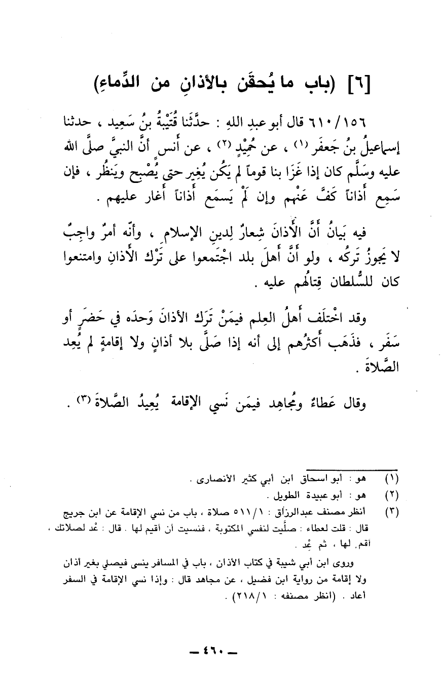 156/ 610 - قال أبو عبد الله: حدثنا قتيبة بن سعيد، حدثنا إسماعيل بن جعفر، عن حميد، عن أنس أن النبي صلى الله عليه وسلم كان إذا غزا بنا قوما لم يكن يغير حتى يصبح وينظر، فإن سمع أذانا كف عنهم وإن لم يسمع أذانا أغار عليهم.