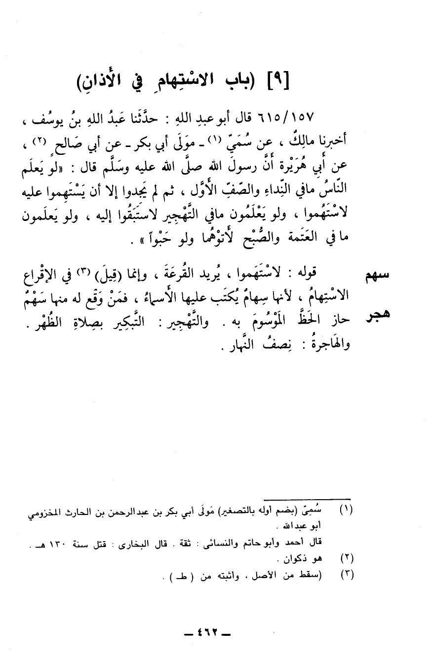 157/ 615 - قال أبو عبد الله: حدثنا عبد الله بن يوسف، أخبرنا مالك، عن سمي -مولى أبي بكر- عن أبي صالح عن أبي هريرة أن رسول الله صلى الله عليه وسلم قال: (لو يعلم الناس ما في النداء والصف الأول، ثم لم يجدوا إلا أن يستهموا عليه لاستهموا، ولو يعلمون ما في التهجير لاستبقوا إليه، ولو يعلمون ما في العتمة والصبح لأتوهما ولو حبوا).