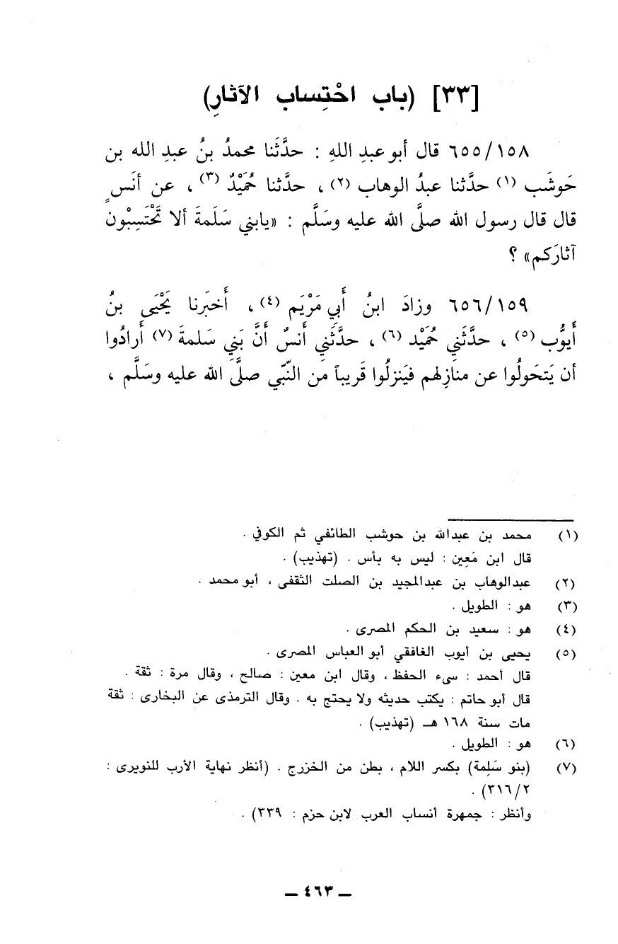 158/ 655 - قال أبو عبد الله: حدثنا محمد بن عبد الله بن حوشب حدثنا عبد الوهاب، حدثنا حميد، عن أنس قال قال رسول الله صلى الله عليه وسلم: (يا بني سلمة ألا تحتسبون آثاركم)؟