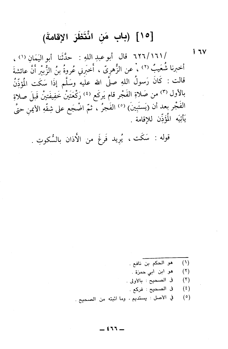 161/ 626 - قال أبو عبد الله: حدثنا أبو اليمان أخبرنا شعيب عن الزهري أخبرني عروة بن الزبير أن عائشة قالت: كان رسول الله صلى الله عليه وسلم إذا سكت المؤذن بالأول من صلاة الفجر قام يركع ركعتين خفيفتين قبل صلاة الفجر بعد أن (يستبين) الفجر ثم اضجع [اضطجع] على شقه الأيمن حتى يأتيه المؤذن للإقامة.