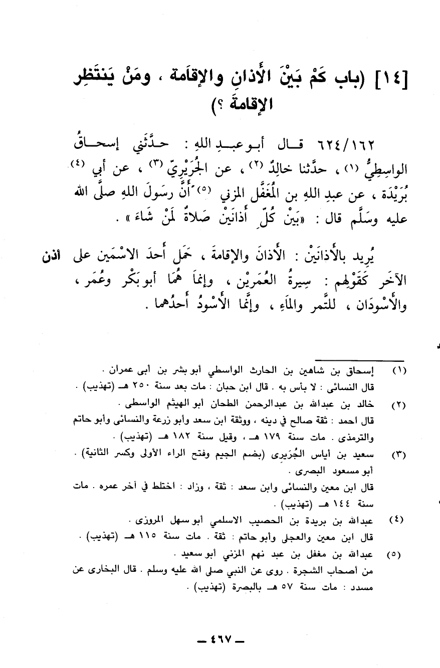 162/ 624 - قال أبو عبد الله: حدثني إسحاق الواسطي، حدثنا خالد، عن الجريري، عن أبي بريدة، عن عبد الله بن المغفل المزني أن رسول الله صلى الله عليه وسلم قال: (بين كل أذانين صلاة لمن شاء).
