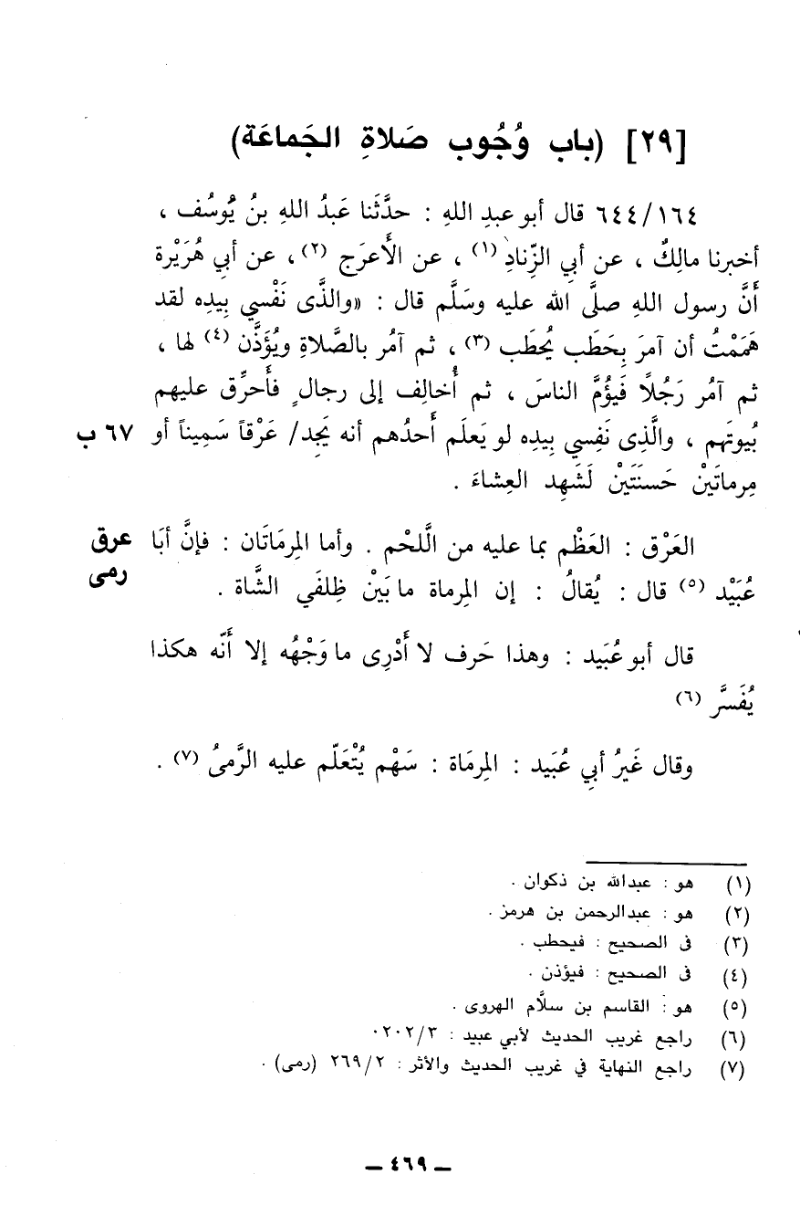 164/ 644 - قال أبو عبد الله: حدثنا عبد الله بن يوسف، أخبرنا مالك، عن أبي الزناد، عن الأعرج، عن أبي هريرة أن رسول الله صلى الله عليه وسلم قال: (والذي نفسي بيده لقد هممت أن آمر بحطب يحطب، ثم آمر بالصلاة ويؤذن لها، ثم آمر رجلا فيؤم الناس، ثم أخالف إلى رجال فأحرق عليهم بيوتهم، والذي نفسي بيده لو يعلم أحدهم أنه يجد عَرْقا سمينا أو مِرْماتين حسنتين لشهد العشاء).
