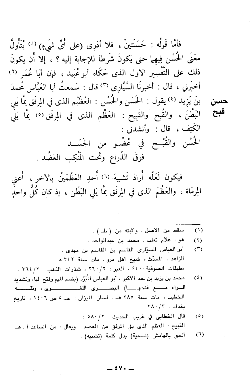 فأما قوله: حسنتين، فلا أدري (على أي شيء) يتأول معنى الحسن فيهما حتى يكون شرطا للإجابة إليه؟ إلا أن يكون ذلك على التفسير الأول الذي حكاه أبو عبيد، فإن أبا عمر أخبرني قال: أخبرنا السياري قال: سمعت أبا العباس محمد بن يزيد يقول: الحَسَن والحُسْن: العُظَيم الذي في المرفق مما يلي البطن، والقبح والقبيح: العظم الذي في المرفق مما يلي الكتف، قال: وأنشدني: