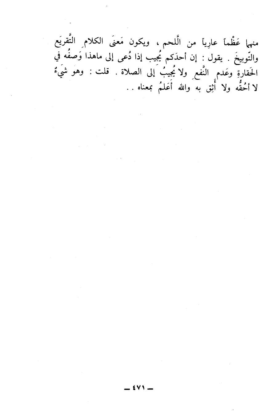 منهما عظماً عارياً من اللحم، ويكون معنى الكلام التقريع والتوبيخ. يقول: إن أحدكم يجيب إذا دُعي إلى ما هذا وصفه في الحقارة وعدم النفع، ولا يجيب إلى الصلاة. قلت: وهو شيء لا أحقه ولا أثق به والله أعلم بمعناه.