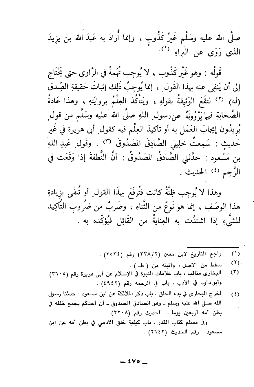 قوله: وهو غير كذوب، لا يوجب تهمة في الراوي حتى يحتاج إلى أن ينفي عنه بهذا القول، إنما يوجب ذلك إثبات حقيقة الصدق (له) لتقع الوثيقة بقوله ويتأكد العلم بروايته، وهذا عادة الصحابة فيما يروونه عن رسول الله صلى الله عليه وسلم من قول يريدون إيجاب العمل به أو تأكيد العلم فيه كقول أبي هريرة في غير حديث: سمعت خليلي الصادق المصدوق. وقول عبد الله بن مسعود: حدثني الصادق المصدوق: أن النطفة إذا وقعت في الرحم الحديث.
