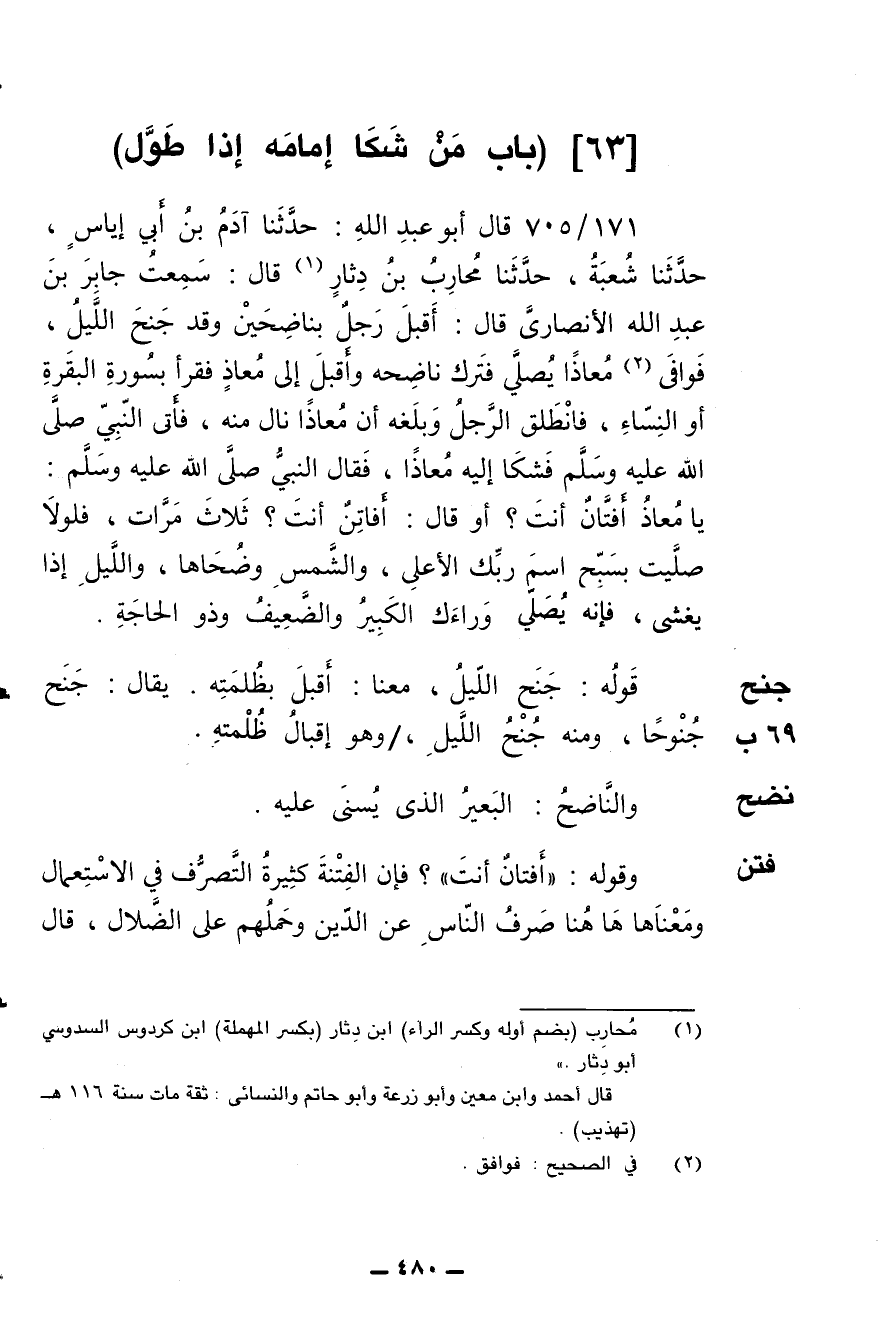 171/ 705 - قال أبو عبد الله: حدثنا آدم بن أبي إياس، حدثنا شعبة، حدثنا محارب بن دثار قال: سمعت جابر بن عبد الله الأنصاري قال: أقبل رجل بناضحين وقد جنح الليل، فوافى معاذا يصلي فترك ناضحه وأقبل إلى معاذ فقرأ بسورة البقرة أو النساء، فانطلق الرجل وبلغه أن معاذا نال منه، فأتى النبي صلى الله عليه وسلم فشكا إليه معاذا، فقال النبي صلى الله عليه وسلم: يا معاذ أفتان أنت؟ أو قال: أفاتن أنت؟ ثلاث مرات، فلولا صليت بسبح اسم ربك الأعلى، والشمس وضحاها، والليل إذا يغشى، فإنه يصلي وراءك الكبير والضعيف وذو الحاجة.