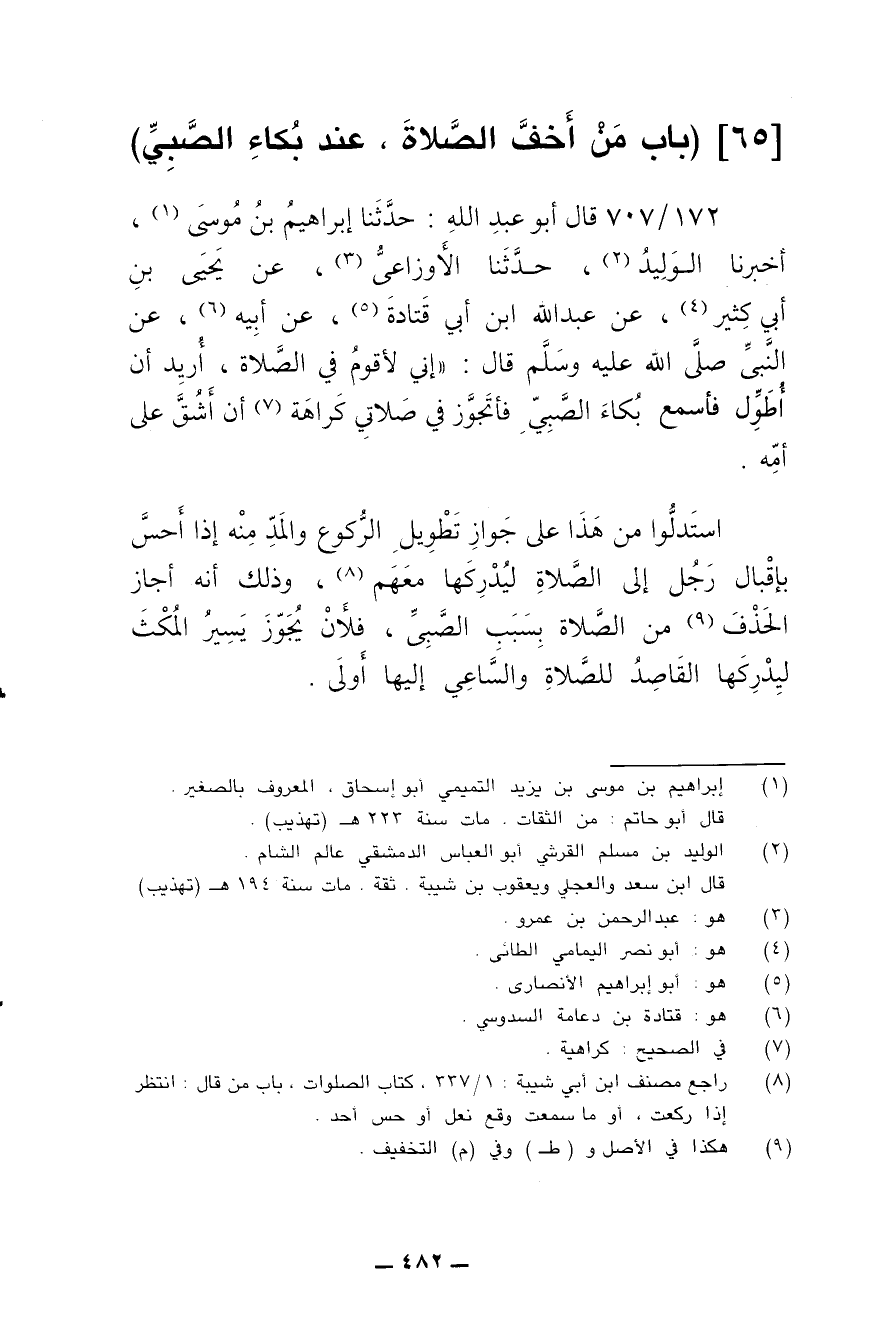 172/ 707 - قال أبو عبد الله: حدثنا إبراهيم بن موسى، أخبرنا الوليد، حدثنا الأوزاعي، عن يحيى بن أبي كثير، عن عبد الله بن أبي قتادة، عن أبيه، عن النبي صلى الله عليه وسلم قال: إني لأقوم في الصلاة، أريد أن أطول، فأسمع بكاء الصبي فأتجوز في صلاتي كراهة أن أشق على أمه.