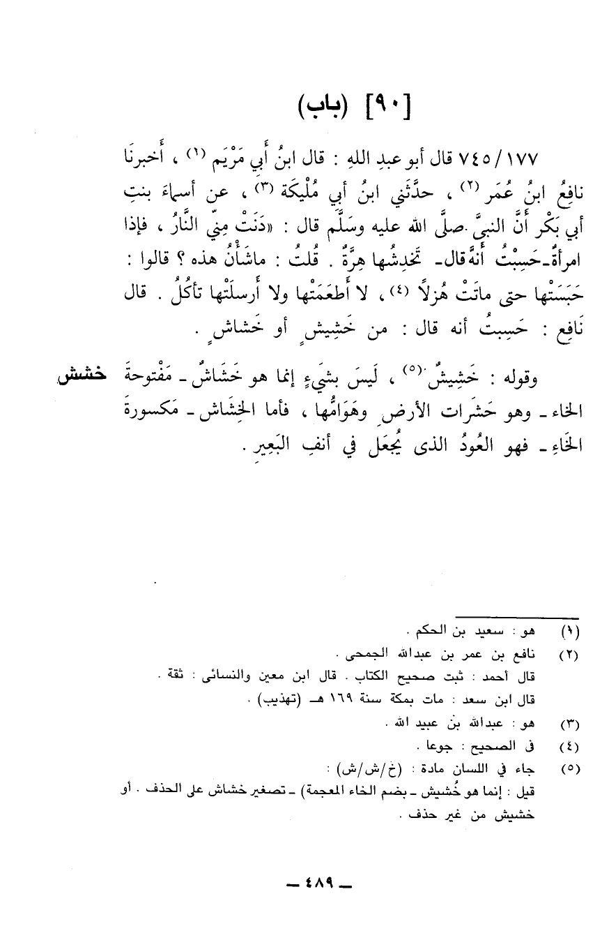 177/ 745 - قال أبو عبد الله: قال ابن أبي مريم: أخبرنا نافع بن عمر، حدثني ابن أبي مليكة، عن أسماء بنت أبي بكر أن النبي صلى الله عليه وسلم قال: (دنت مني النار، فإذا امرأة -حسبت أنه قال- تخدشها هرة، قلت: ما شأن هذه؟ قالوا: حبستها حتى ماتت هزلا، لا أطعمتها ولا أرسلتها تأكل. قال نافع: حسبت أنه قال: من خشيش أو خشاش.
