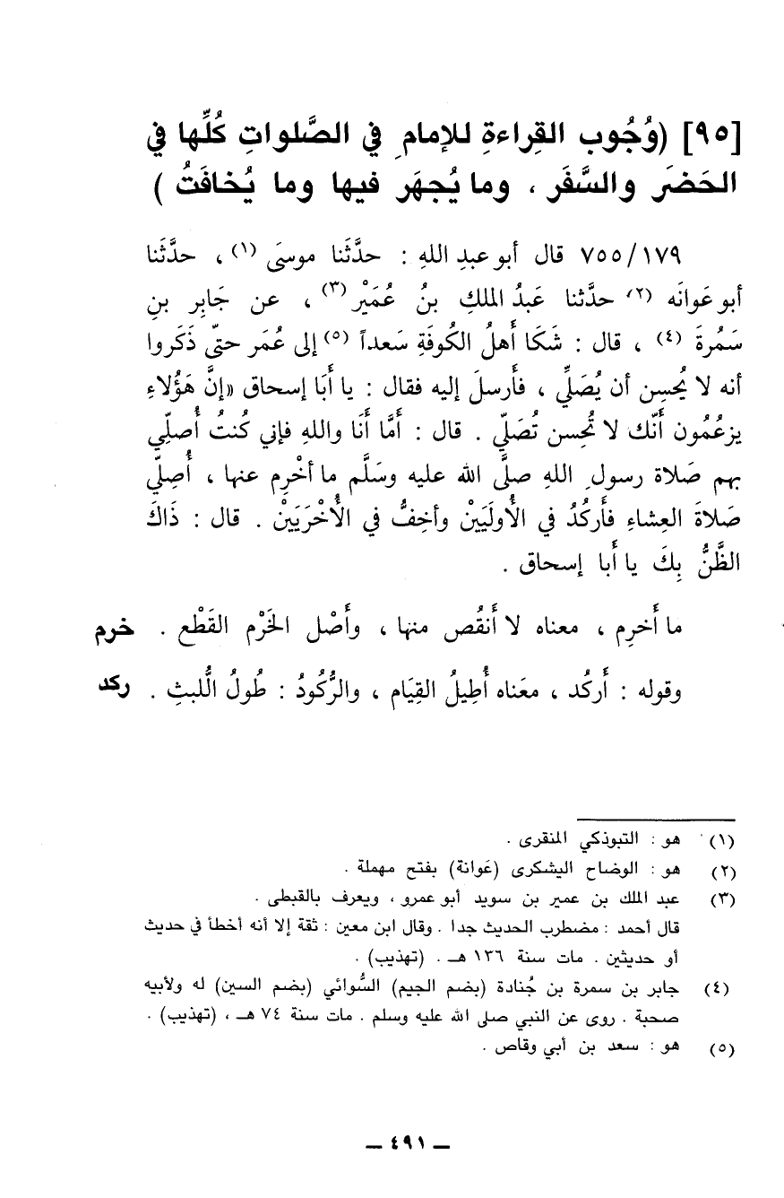 [95] (وجوب القراءة للإمام في الصلوات كلها في الحضر والسفر، وما يجهر فيها وما يخافت)