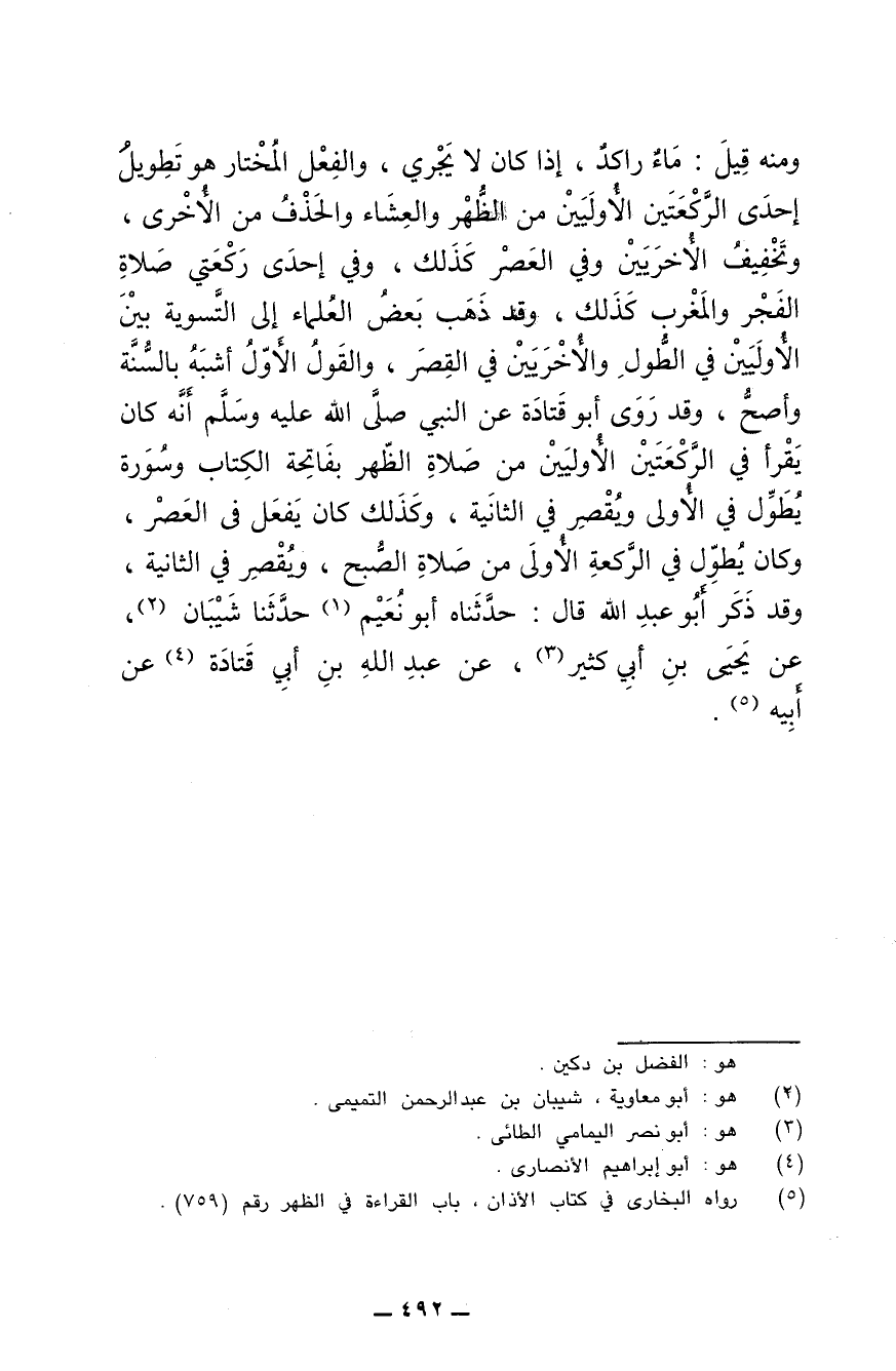 ومنه قيل: ماء راكد، إذا كان لا يجري، والفعل المختار هو تطويل إحدى الركعتين الأوليين من الظهر والعشاء والحذف من الأخرى، وتخفيف الأخريين وفي العصر كذلك، وفي إحدى ركعتي صلاة الفجر والمغرب كذلك، وقد ذهب بعض العلماء إلى التسوية بين الأوليين في الطول والأخريين في القصر، والقول الأول أشبه بالسنة وأصح، وقد روى أبو قتادة عن النبي صلى الله عليه وسلم أنه كان يقرأ في الركعتين الأوليين من صلاة الظهر بفاتحة الكتاب وسورة يطول في الأولى ويقصر في الثانية، وكذلك كان يفعل في العصر، وكان يطول في الركعة الأولى من صلاة الصبح ويقصر في الثانية، وقد ذكر أبو عبد الله قال: حدثناه أبو نعيم حدثنا شيبان، عن يحيى بن أبي كثير، عن عبد الله بن أبي قتادة عن أبيه.