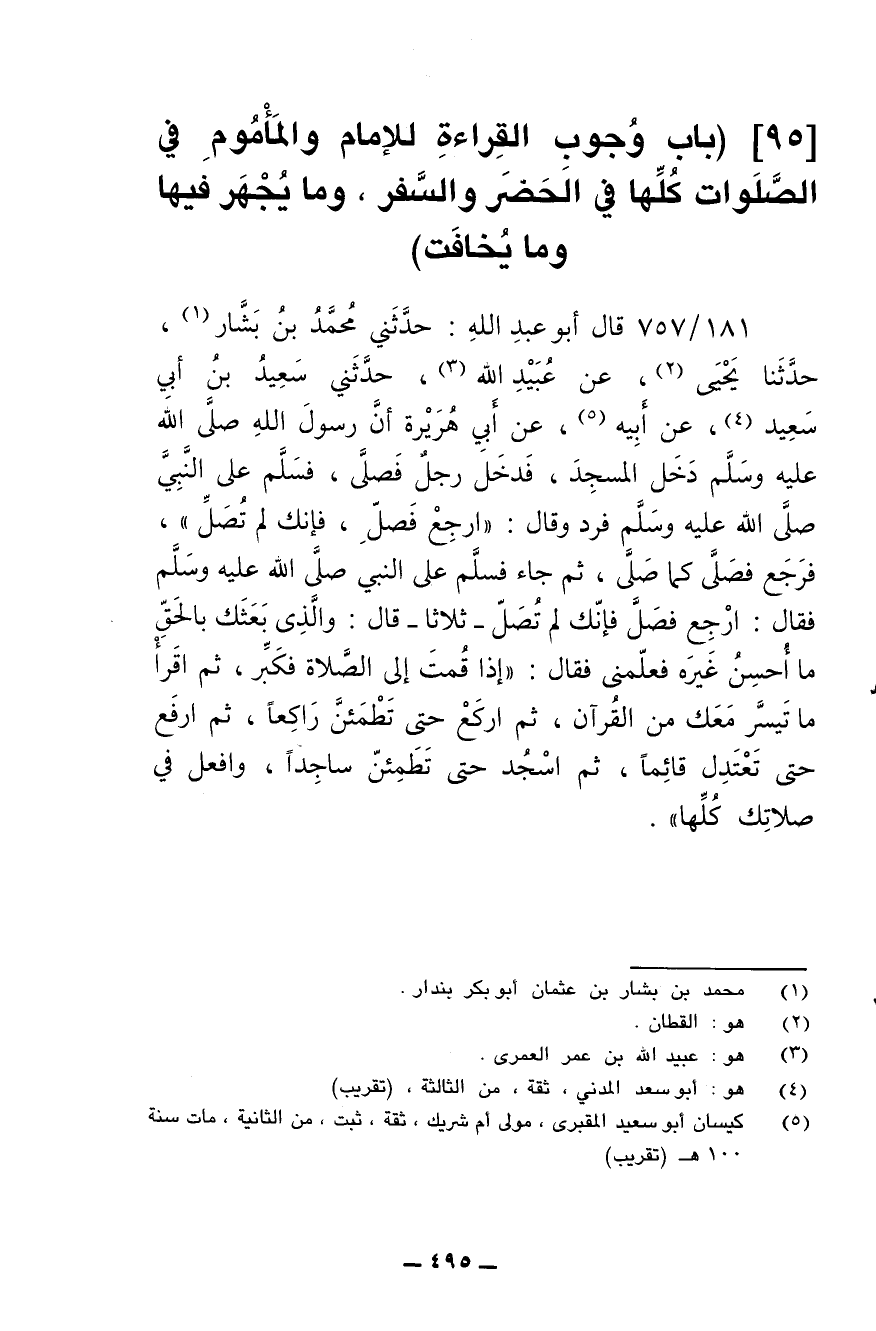 181/ 757 - قال أبو عبد الله: حدثني محمد بن بشار، حدثنا يحيى، عن عبيد الله، حدثني سعيد بن أبي سعيد، عن أبيه، عن أبي هريرة أن رسول الله صلى الله عليه وسلم دخل المسجد، فدخل رجل فصلى، فسلم على النبي صلى الله عليه وسلم فرد وقال: (ارجع فصل، فإنك لم تصل)، فرجع فصلى كما صلى، ثم جاء فسلم على النبي صلى الله عليه وسلم فقال: ارجع فصل فإنك لم تصل -ثلاثا- قال: والذي بعثك بالحق ما أحسن غيره فعلمني، فقال: (إذا قمت إلى الصلاة فكبر، ثم اقرأ ما تيسر معك من القرآن، ثم اركع حتى تطمئن راكعا، ثم ارفع حتى تعتدل قائما، ثم اسجد حتى تطمئن ساجدا، وافعل في صلاتك كلها).