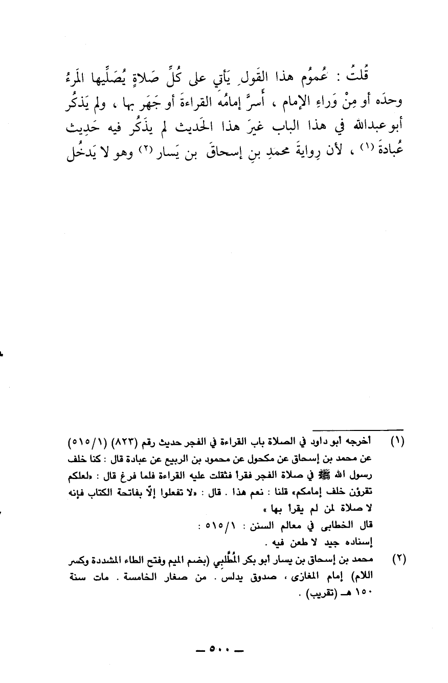 قلت: عموم هذا القول يأتي على كل صلاة يصليها المرء وحده أو من وراء الإمام، أسر إمامه القراءة أو جهر بها، ولم يذكر أبو عبد الله في هذا الباب غير هذا الحديث، لم يذكر فيه حديث عبادة؛ لأن رواية [راويه] محمد بن إسحاق بن يسار وهو لا يدخل
