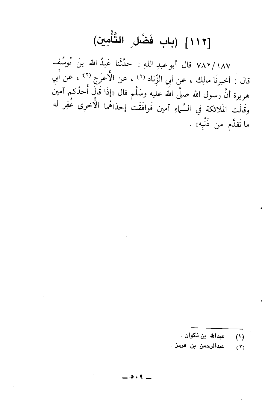 187/ 782 - قال أبو عبد الله: حدثنا عبد الله بن يوسف قال: أخبرنا مالك، عن أبي الزناد، عن الأعرج، عن أبي هريرة أن رسول الله صلى الله عليه وسلم قال: (إذا قال أحدكم آمين وقالت الملائكة في السماء آمين فوافقت إحداهما الأخرى غفر له ما تقدم من ذنبه).